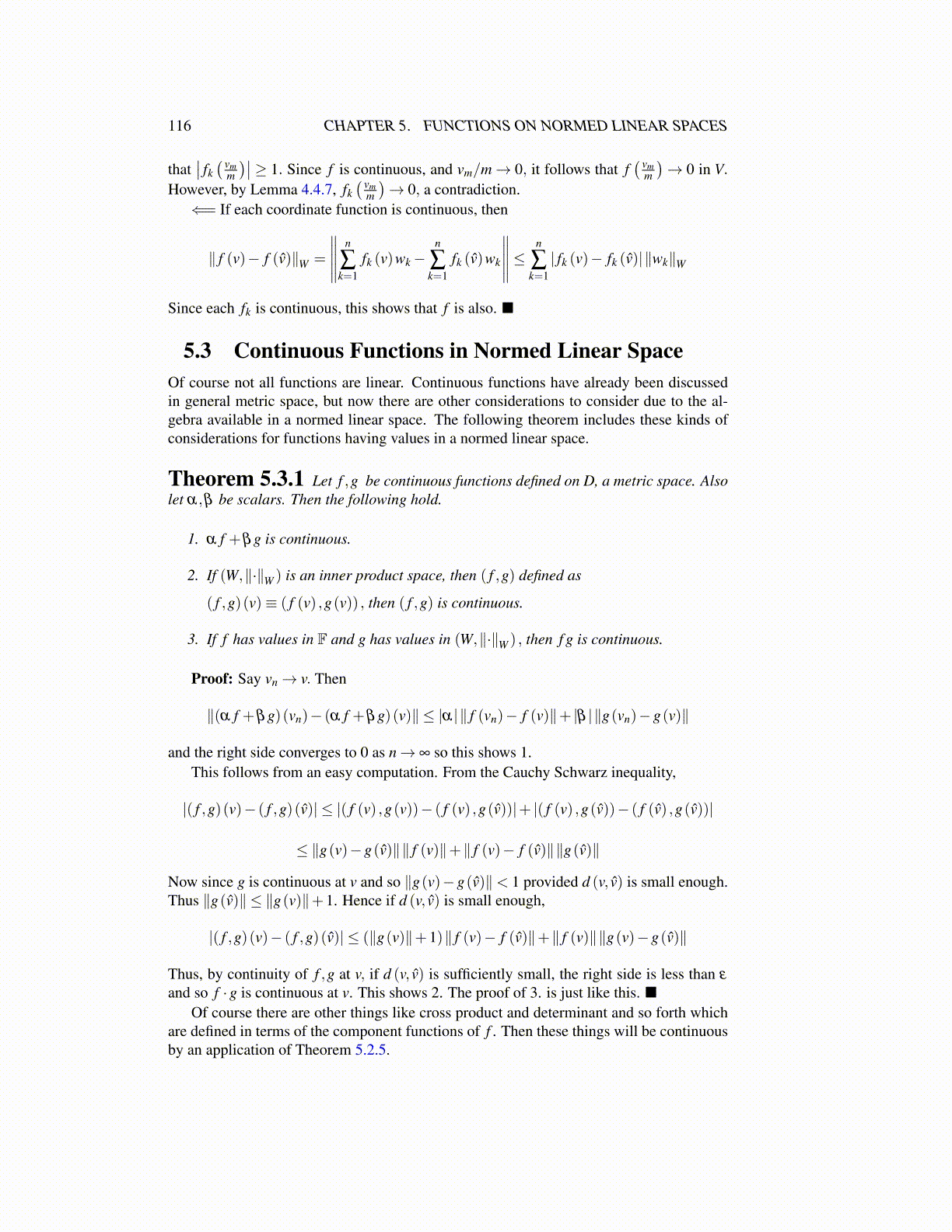 5.3 Continuous Functions in Normed Linear SpaceOf course not all functions are linear. Continuous functions have already been discussedin general metric space, but now there are other considerations to consider due to the al-gebra available in a normed linear space. The following theorem includes these kinds ofconsiderations for functions having values in a normed linear space.
