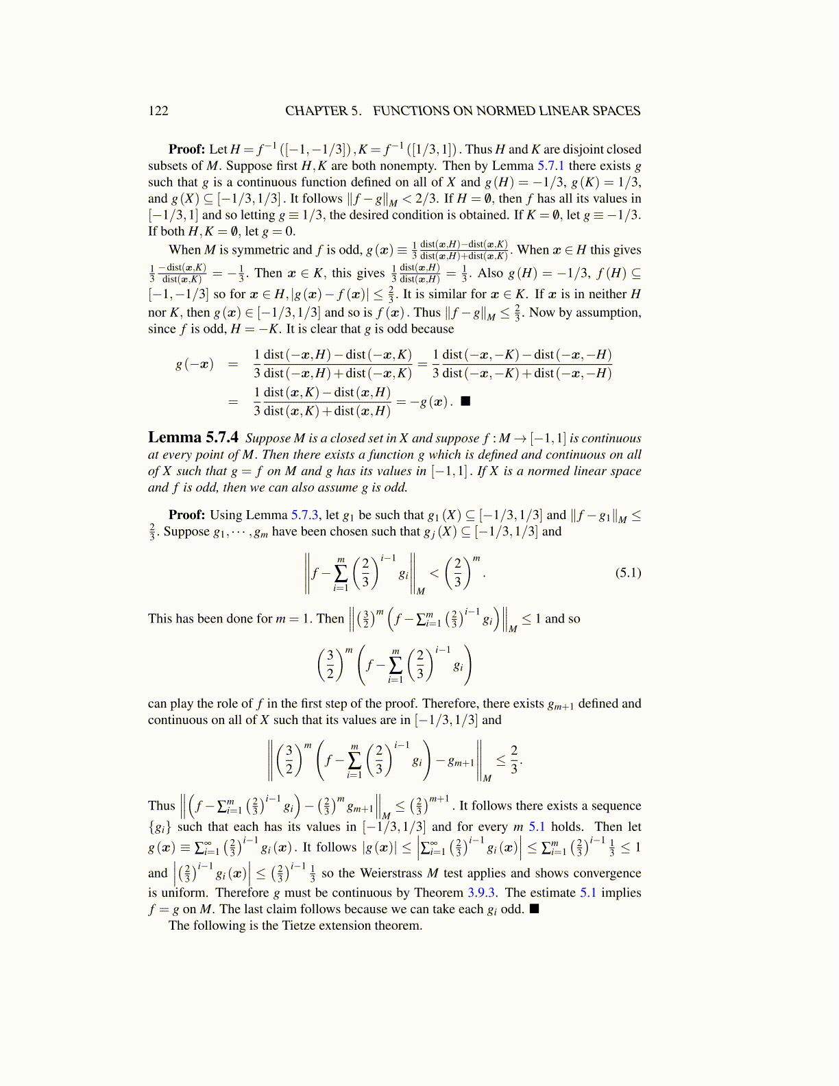 Lemma 5.7.4 Suppose M is a closed set in X and suppose f : M→ [−1,1] is continuousat every point of M. Then there exists a function g which is defined and continuous on allof X such that g = f on M and g has its values in [−1,1] . If X is a normed linear spaceand f is odd, then we can also assume g is odd.