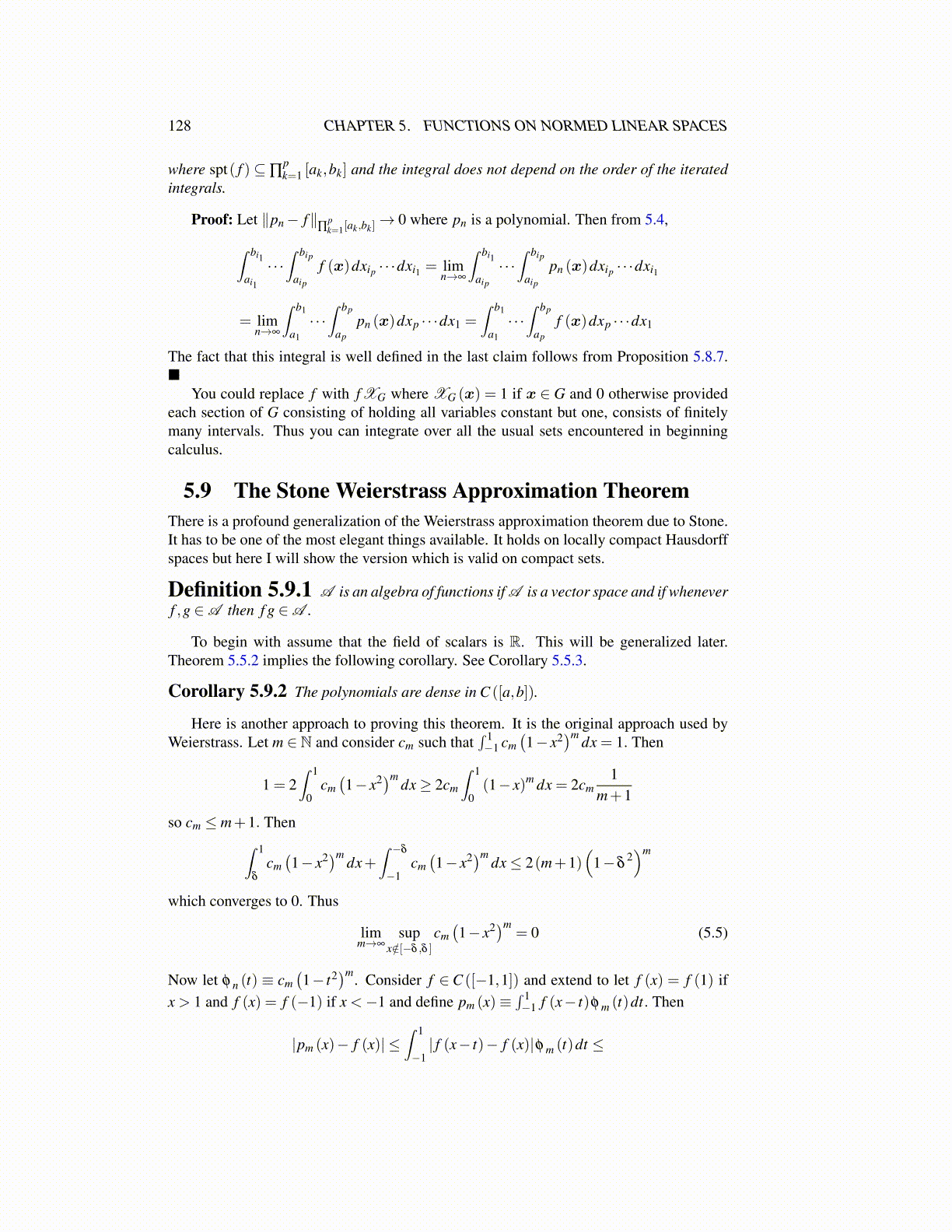5.9 The Stone Weierstrass Approximation TheoremThere is a profound generalization of the Weierstrass approximation theorem due to Stone.It has to be one of the most elegant things available. It holds on locally compact Hausdorffspaces but here I will show the version which is valid on compact sets.