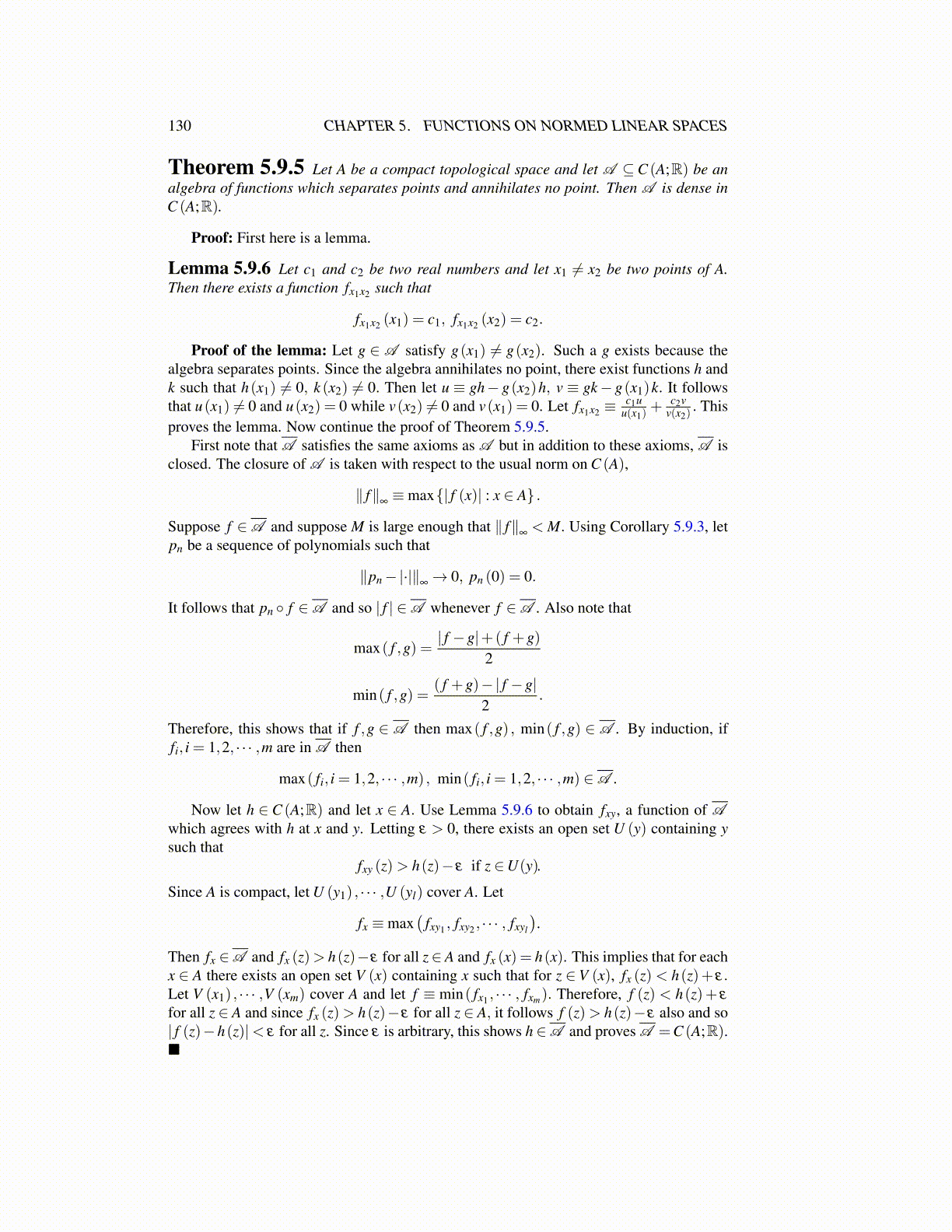 Theorem 5.9.5 Let A be a compact topological space and let A ⊆C (A;R) be analgebra of functions which separates points and annihilates no point. Then A is dense inC (A;R).