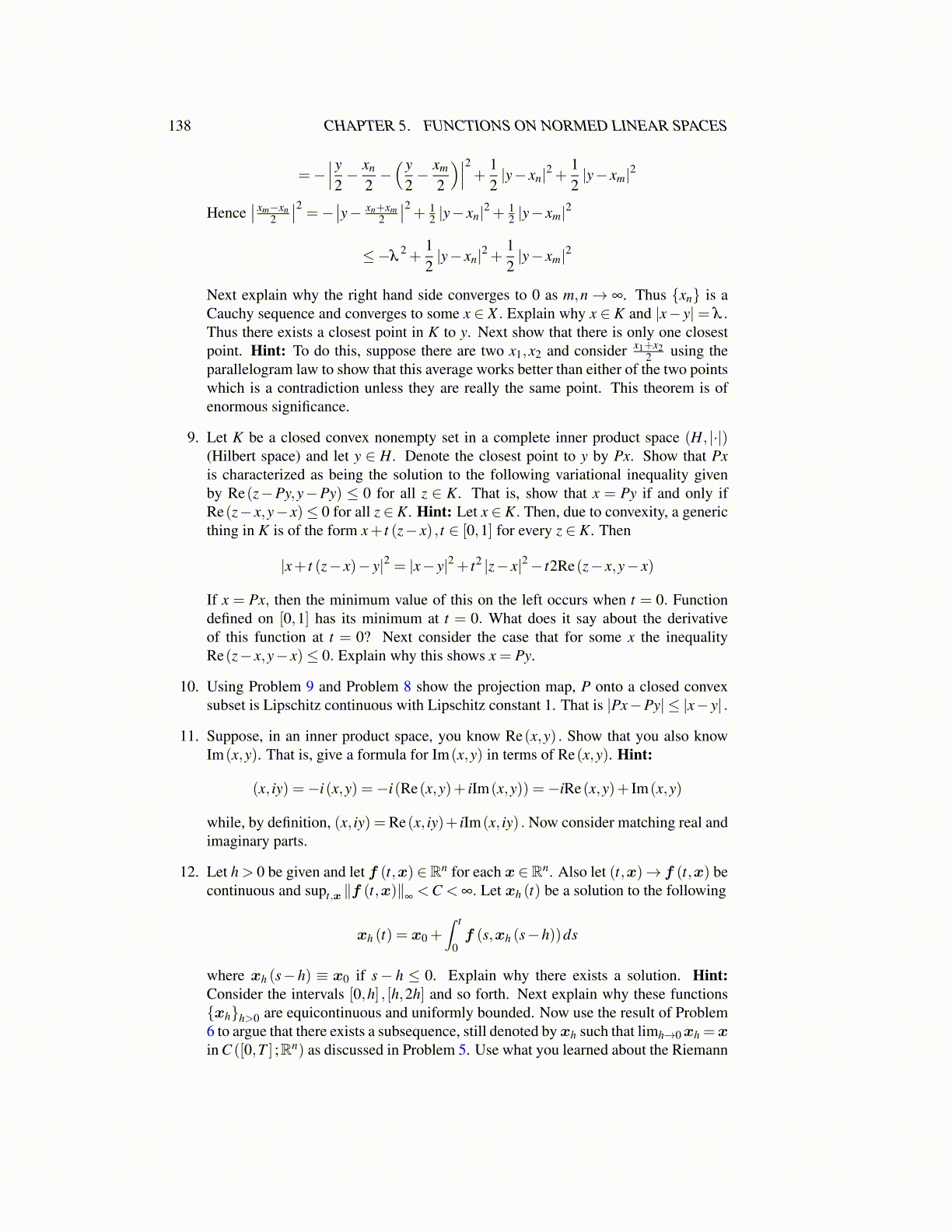 9. Let K be a closed convex nonempty set in a complete inner product space (H, |·|)(Hilbert space) and let y ∈ H. Denote the closest point to y by Px. Show that Pxis characterized as being the solution to the following variational inequality givenby Re(z−Py,y−Py) ≤ 0 for all z ∈ K. That is, show that x = Py if and only ifRe(z− x,y− x)≤ 0 for all z ∈ K. Hint: Let x ∈ K. Then, due to convexity, a genericthing in K is of the form x+ t (z− x) , t ∈ [0,1] for every z ∈ K. Then