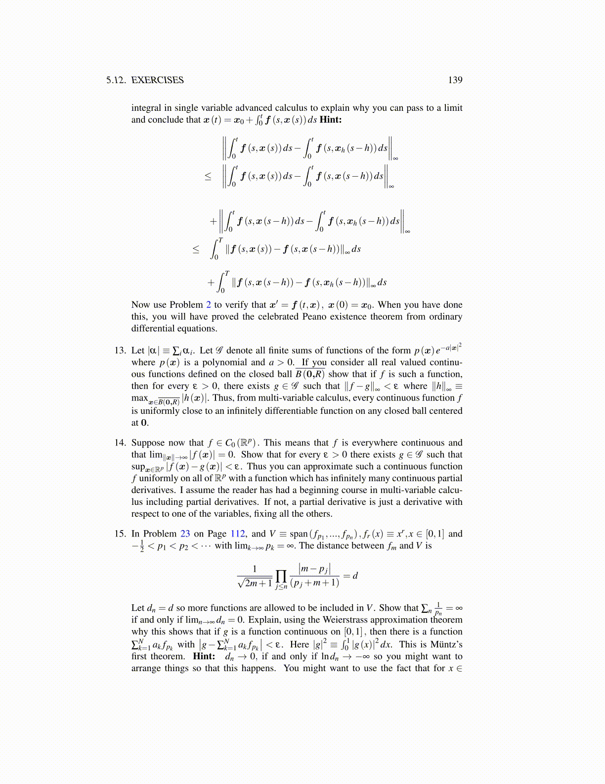 14. Suppose now that f ∈ C0 (Rp) . This means that f is everywhere continuous andthat lim∥x∥→∞ | f (x)| = 0. Show that for every ε > 0 there exists g ∈ G such thatsupx∈Rp | f (x)−g(x)| < ε . Thus you can approximate such a continuous functionf uniformly on all ofRp with a function which has infinitely many continuous partialderivatives. I assume the reader has had a beginning course in multi-variable calcu-lus including partial derivatives. If not, a partial derivative is just a derivative withrespect to one of the variables, fixing all the others.