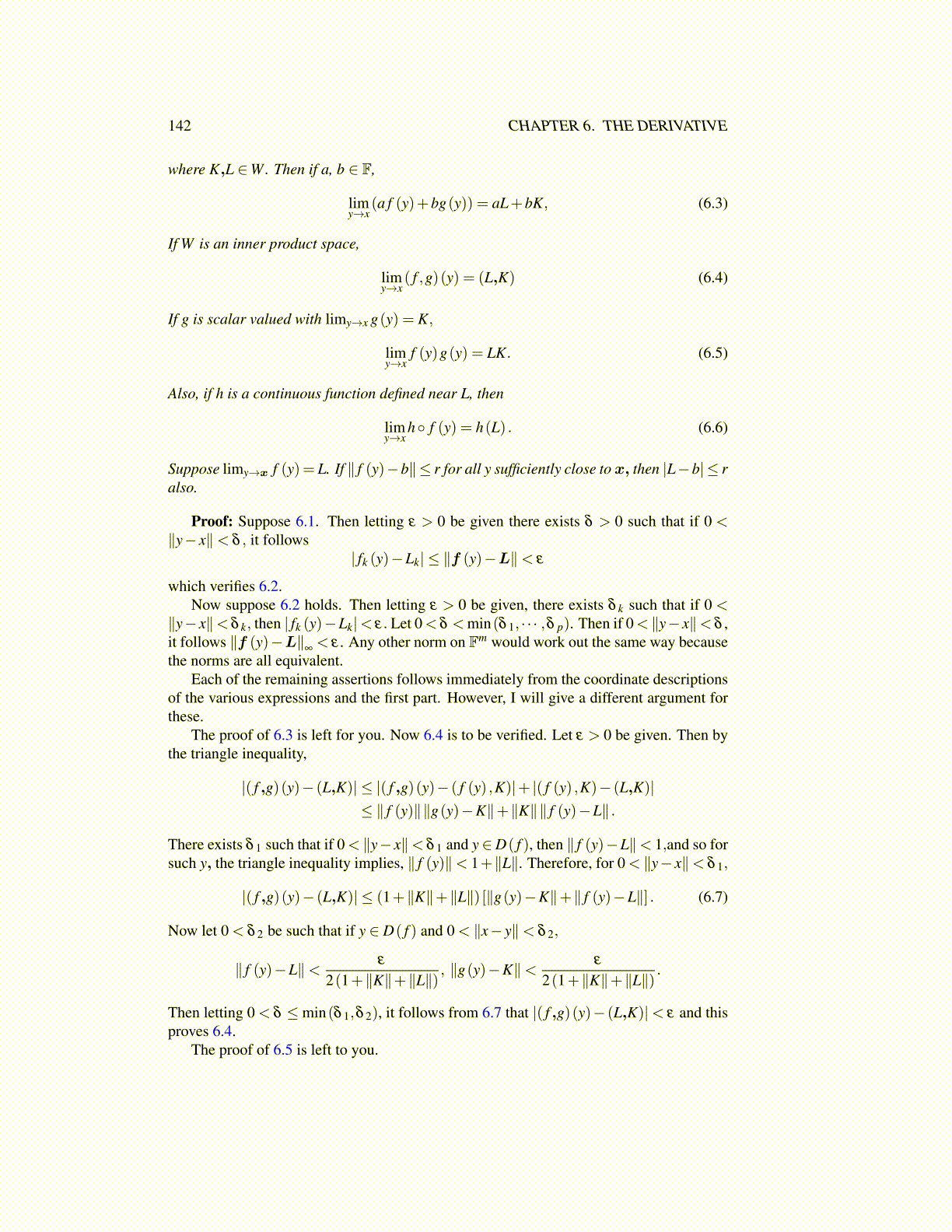Proof: Suppose 6.1. Then letting ε > 0 be given there exists δ > 0 such that if 0 <∥y− x∥< δ , it follows
