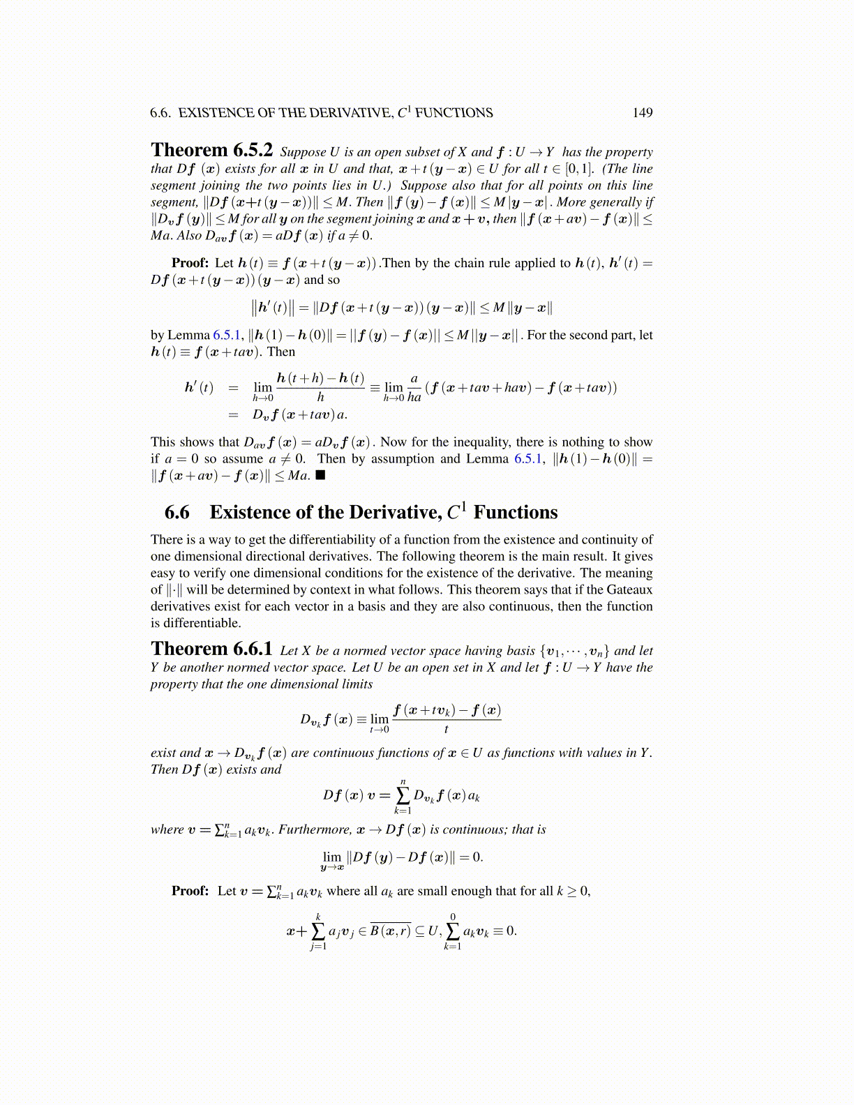 6.6 Existence of the Derivative, C1 FunctionsThere is a way to get the differentiability of a function from the existence and continuity ofone dimensional directional derivatives. The following theorem is the main result. It giveseasy to verify one dimensional conditions for the existence of the derivative. The meaningof ∥·∥ will be determined by context in what follows. This theorem says that if the Gateauxderivatives exist for each vector in a basis and they are also continuous, then the functionis differentiable.