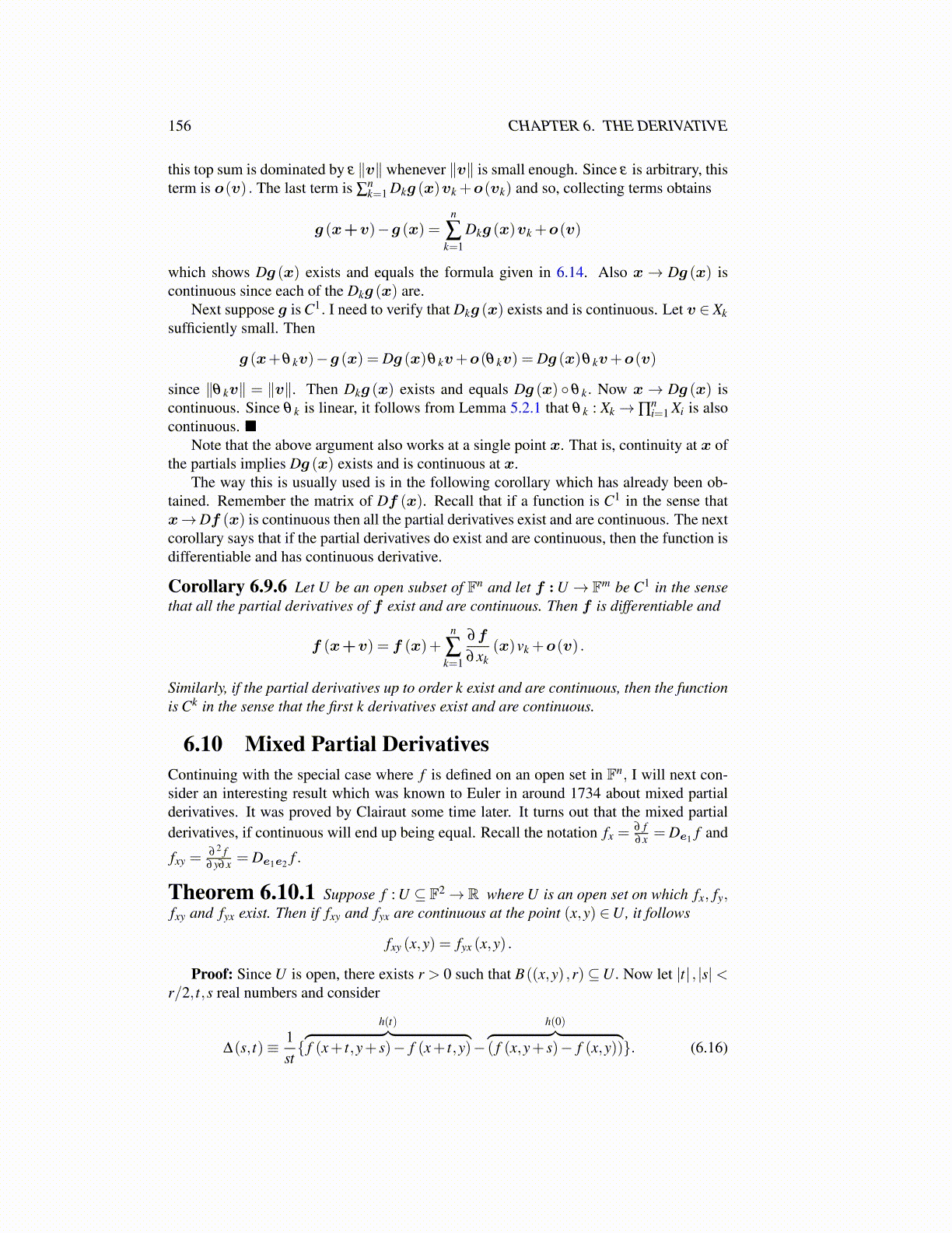 6.10 Mixed Partial DerivativesContinuing with the special case where f is defined on an open set in Fn, I will next con-sider an interesting result which was known to Euler in around 1734 about mixed partialderivatives. It was proved by Clairaut some time later. It turns out that the mixed partialderivatives, if continuous will end up being equal. Recall the notation fx =