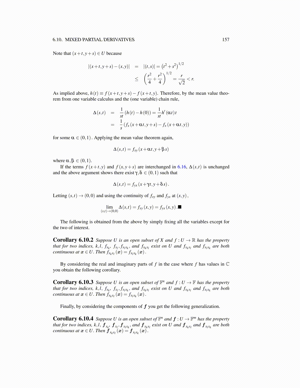 Corollary 6.10.3 Suppose U is an open subset of Fn and f : U → F has the propertythat for two indices, k, l, fxk , fxl , fxlxk , and fxkxl exist on U and fxkxl and fxlxk are bothcontinuous at x ∈U. Then fxkxl (x) = fxlxk (x) .