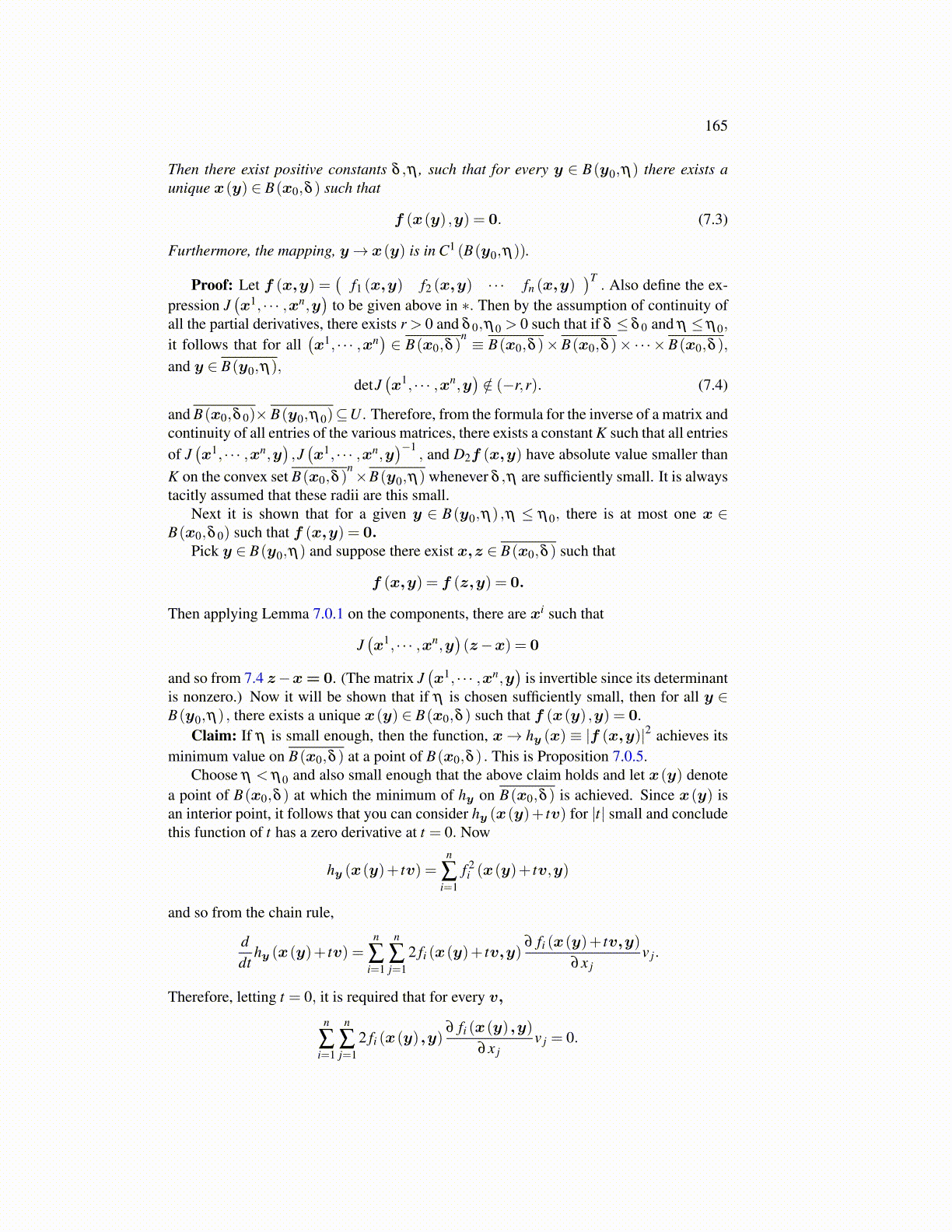 is nonzero.) Now it will be shown that if η is chosen sufficiently small, then for all y ∈B(y0,η) , there exists a unique x(y) ∈ B(x0,δ ) such that f (x(y) ,y) = 0.
