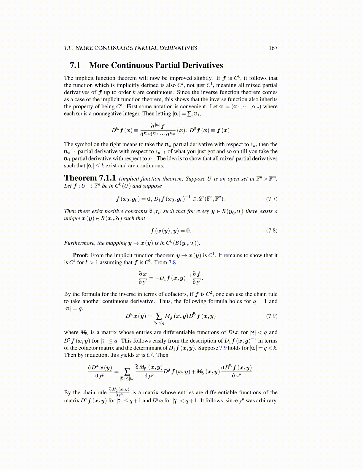 7.1 More Continuous Partial DerivativesThe implicit function theorem will now be improved slightly. If f is Ck, it follows thatthe function which is implicitly defined is also Ck, not just C1, meaning all mixed partialderivatives of f up to order k are continuous. Since the inverse function theorem comesas a case of the implicit function theorem, this shows that the inverse function also inheritsthe property of being Ck. First some notation is convenient. Let α = (α1, · · · ,αn) whereeach α i is a nonnegative integer. Then letting |α|= ∑i α i,