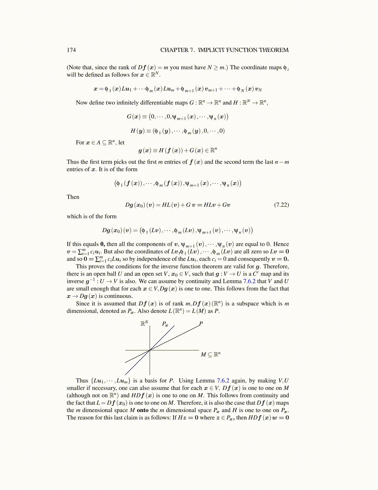 Thus {Lu1, · · · ,Lum} is a basis for P. Using Lemma 7.6.2 again, by making V,Usmaller if necessary, one can also assume that for each x ∈ V, Df (x) is one to one on M(although not on Rn) and HDf (x) is one to one on M. This follows from continuity andthe fact that L =Df (x0) is one to one on M. Therefore, it is also the case that Df (x) mapsthe m dimensional space M onto the m dimensional space Px and H is one to one on Px.The reason for this last claim is as follows: If Hz = 0 where z ∈ Px, then HDf (x)w = 0