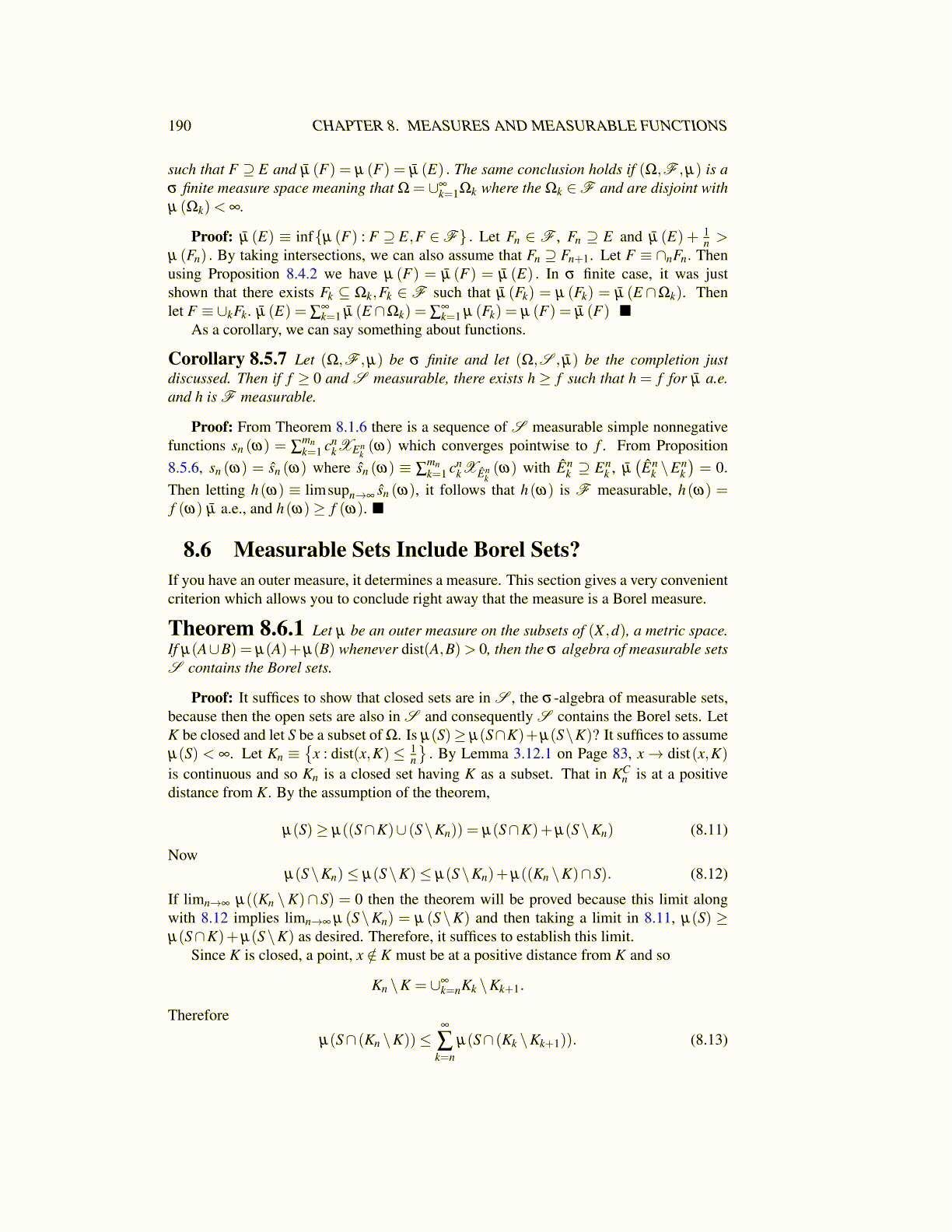 8.6 Measurable Sets Include Borel Sets?If you have an outer measure, it determines a measure. This section gives a very convenientcriterion which allows you to conclude right away that the measure is a Borel measure.