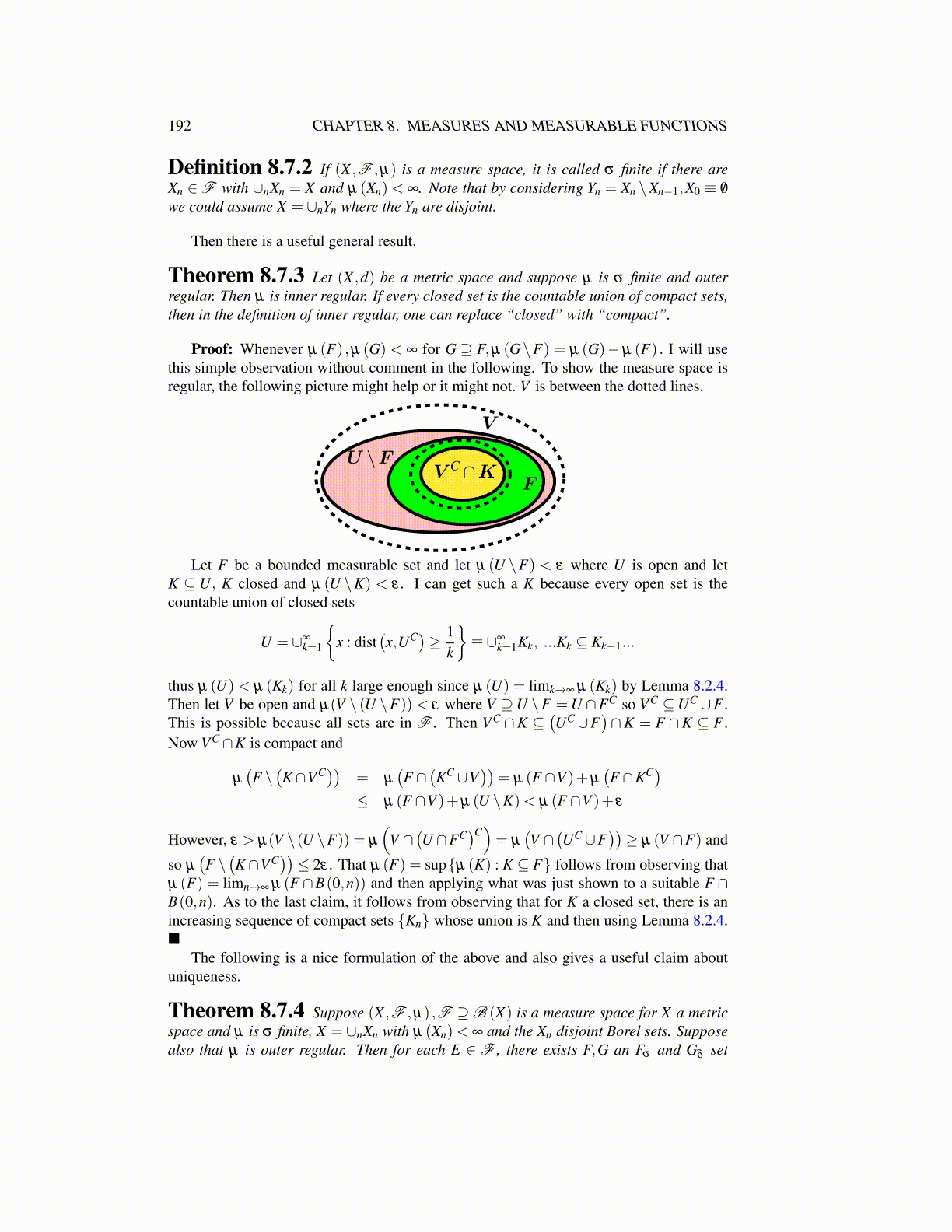 µ (F) = limn→∞ µ (F ∩B(0,n)) and then applying what was just shown to a suitable F ∩B(0,n). As to the last claim, it follows from observing that for K a closed set, there is anincreasing sequence of compact sets {Kn} whose union is K and then using Lemma 8.2.4.■