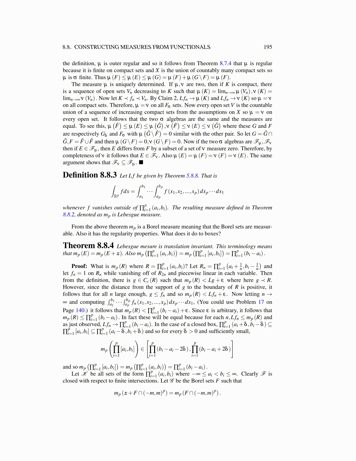 Theorem 8.8.4 Lebesgue mesure is translation invariant. This terminology meansthat mp (E) = mp (E +z). Also mp