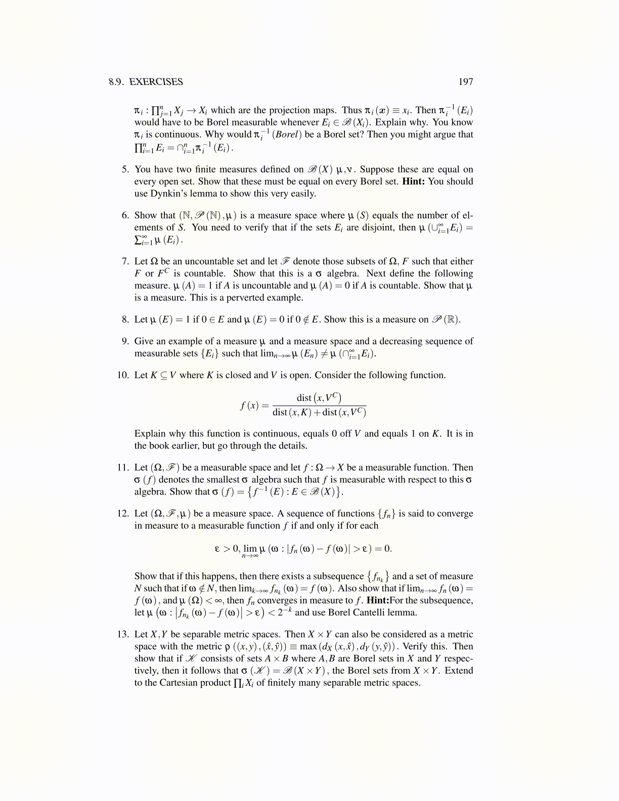 13. Let X ,Y be separable metric spaces. Then X ×Y can also be considered as a metricspace with the metric ρ ((x,y) ,(x̂, ŷ)) ≡ max(dX (x, x̂) ,dY (y, ŷ)) . Verify this. Thenshow that if K consists of sets A×B where A,B are Borel sets in X and Y respec-tively, then it follows that σ (K ) = B (X×Y ) , the Borel sets from X ×Y . Extendto the Cartesian product ∏i Xi of finitely many separable metric spaces.