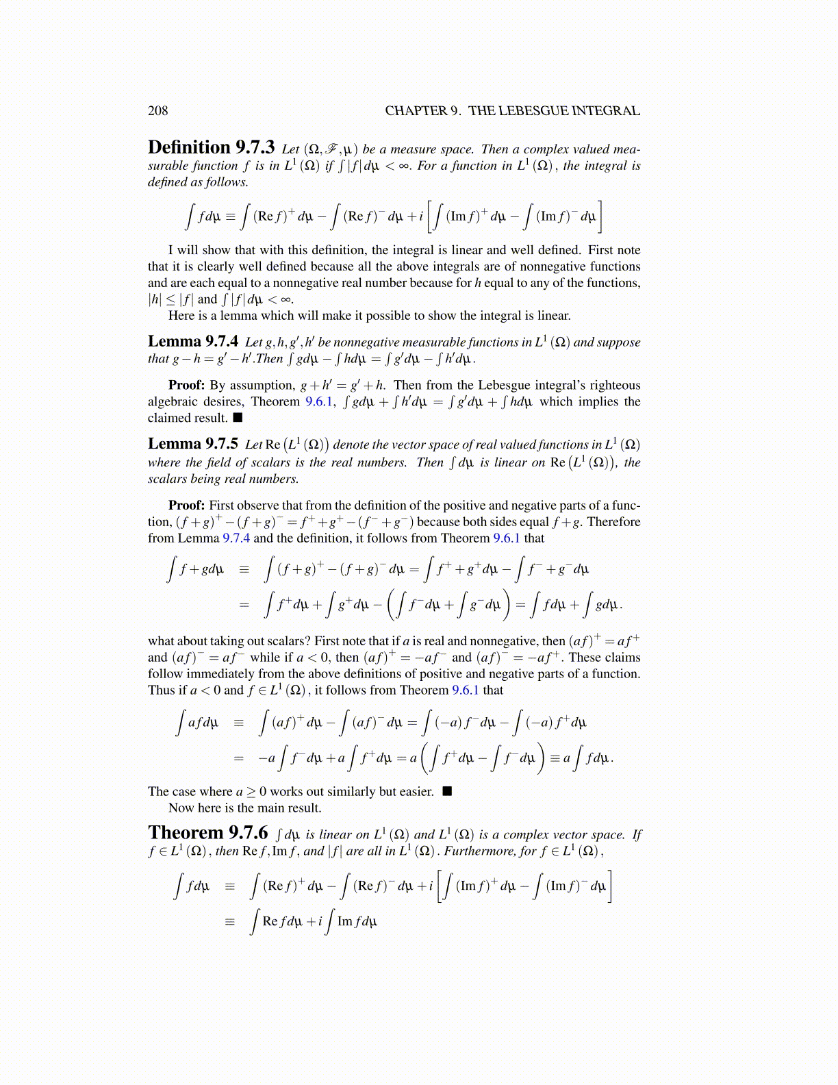Theorem 9.7.6 ∫dµ is linear on L1 (Ω) and L1 (Ω) is a complex vector space. If