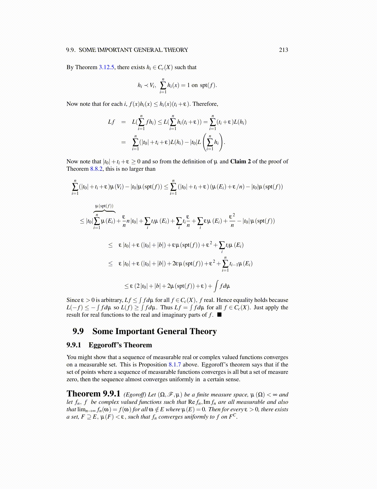 9.9 Some Important General Theory9.9.1 Eggoroff’s TheoremYou might show that a sequence of measurable real or complex valued functions convergeson a measurable set. This is Proposition 8.1.7 above. Eggoroff’s theorem says that if theset of points where a sequence of measurable functions converges is all but a set of measurezero, then the sequence almost converges uniformly in a certain sense.