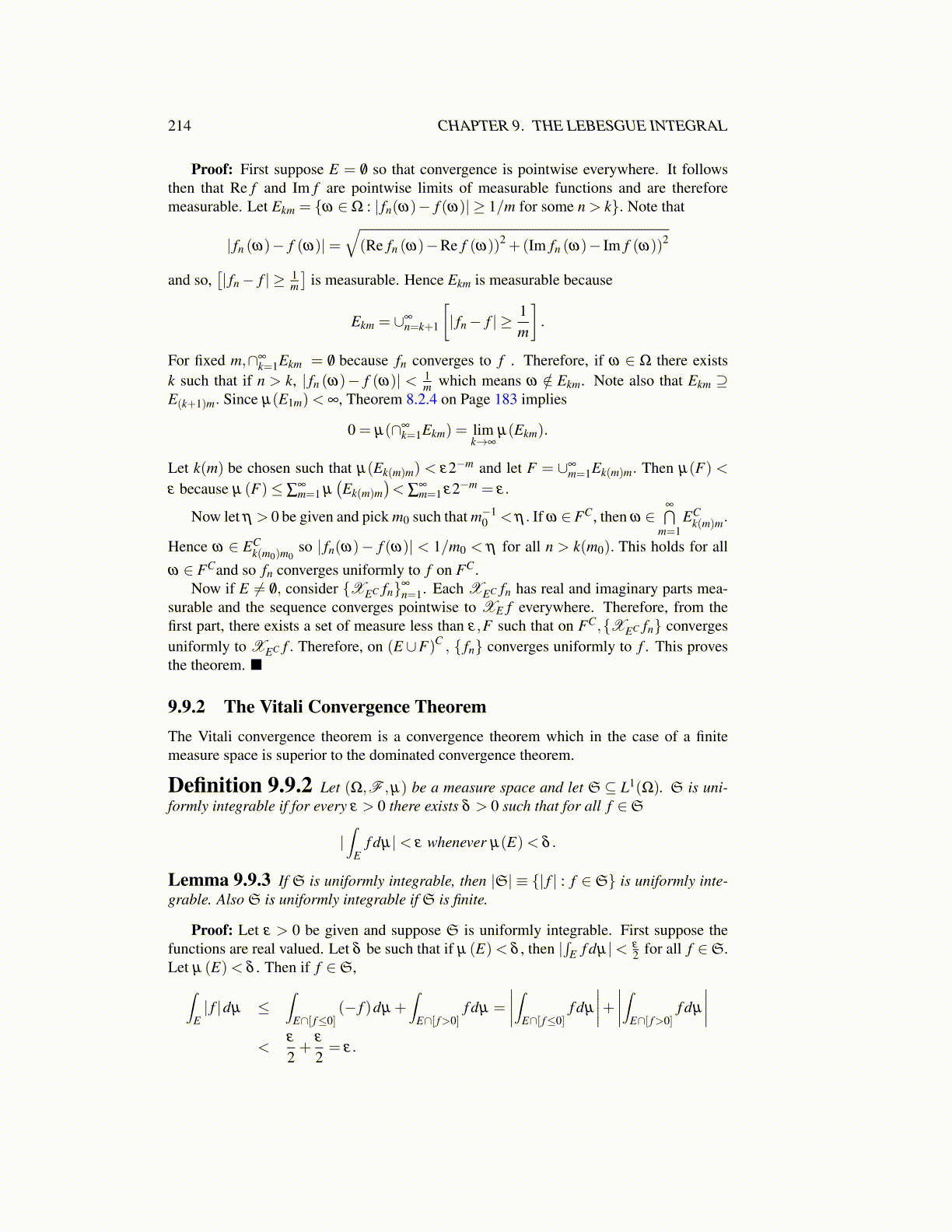 9.9.2 The Vitali Convergence TheoremThe Vitali convergence theorem is a convergence theorem which in the case of a finitemeasure space is superior to the dominated convergence theorem.