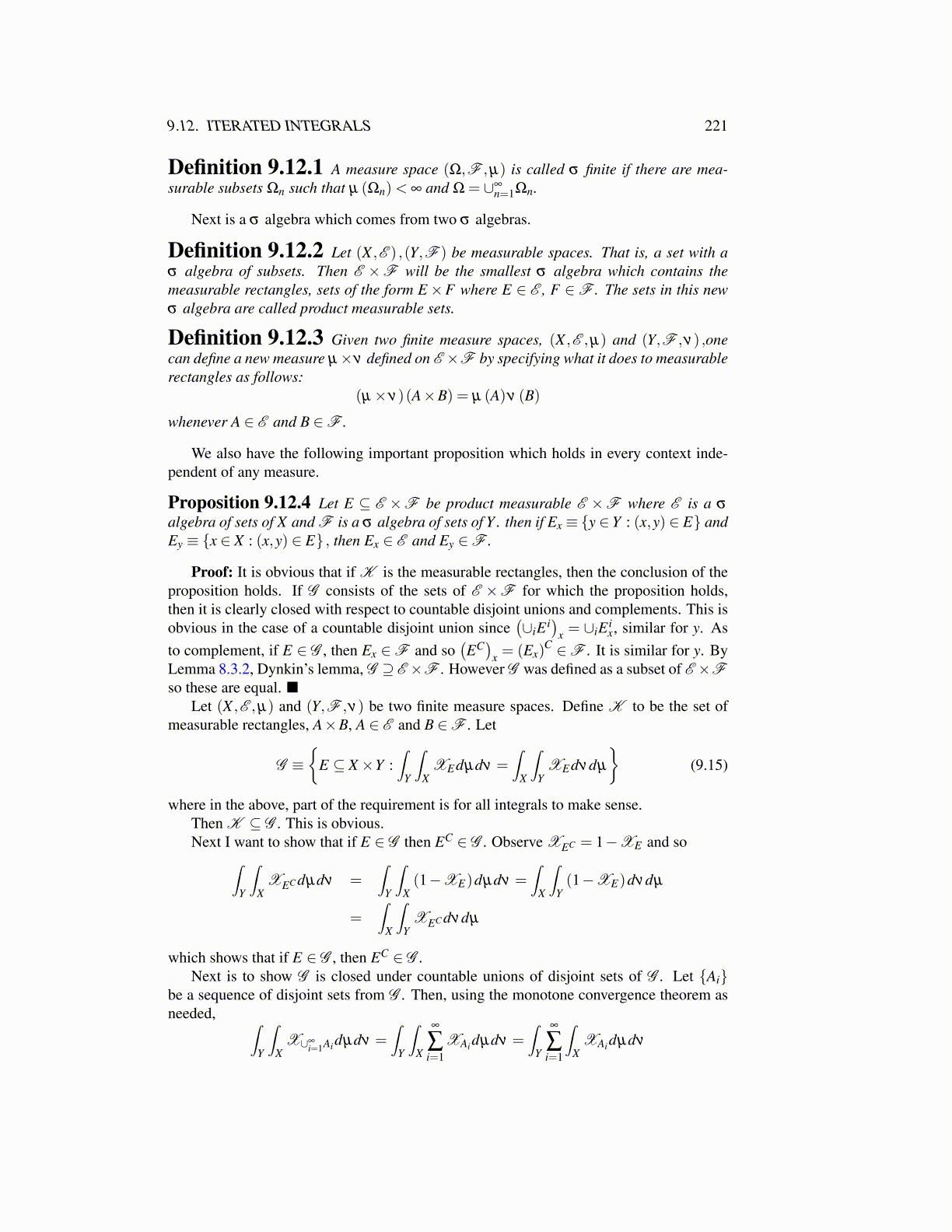 Definition 9.12.2 Let (X ,E ) ,(Y,F ) be measurable spaces. That is, a set with aσ algebra of subsets. Then E ×F will be the smallest σ algebra which contains themeasurable rectangles, sets of the form E×F where E ∈ E , F ∈F . The sets in this newσ algebra are called product measurable sets.