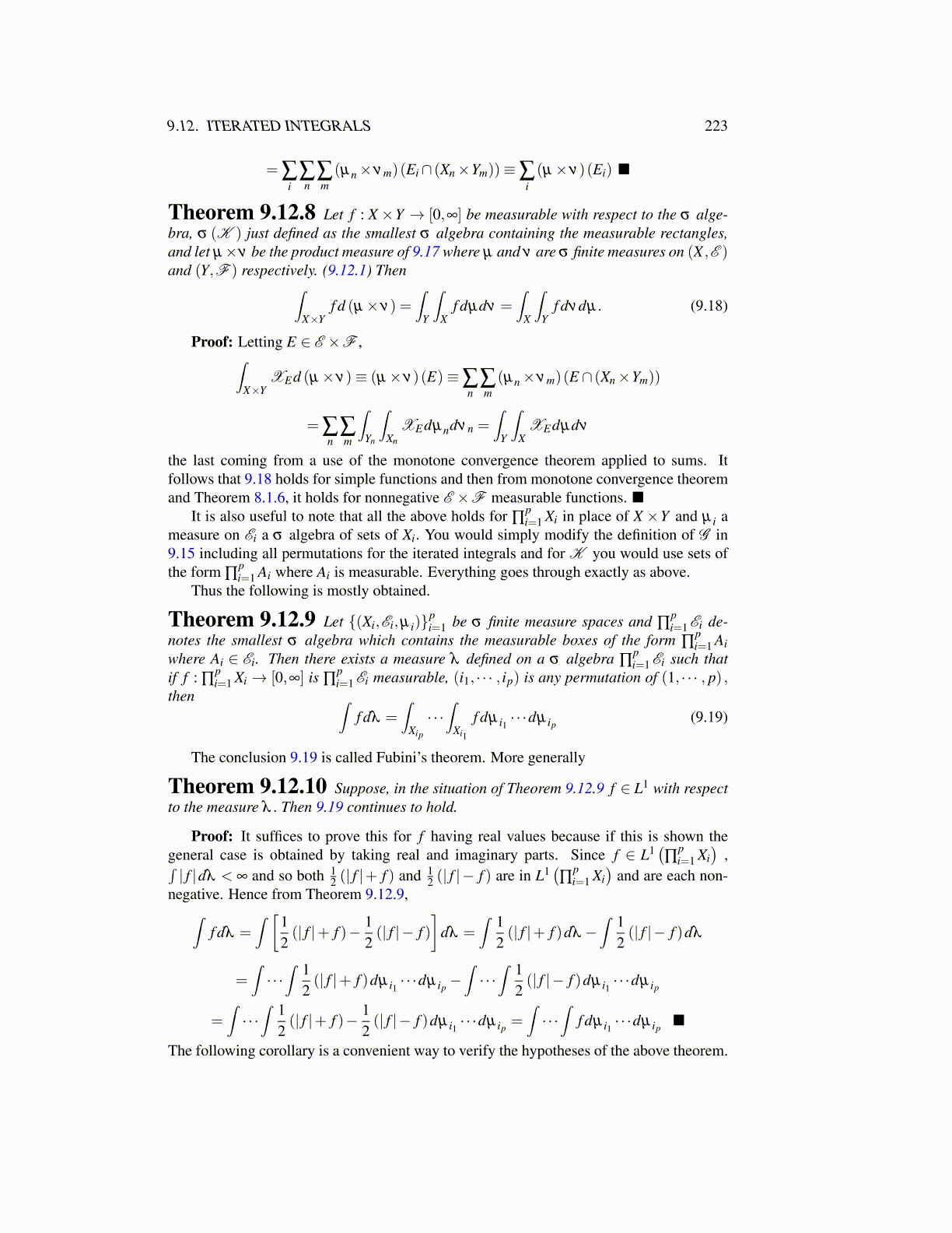 Theorem 9.12.8 Let f : X ×Y → [0,∞] be measurable with respect to the σ alge-bra, σ (K ) just defined as the smallest σ algebra containing the measurable rectangles,and let µ×ν be the product measure of 9.17 where µ and ν are σ finite measures on (X ,E )and (Y,F ) respectively. (9.12.1) Then∫