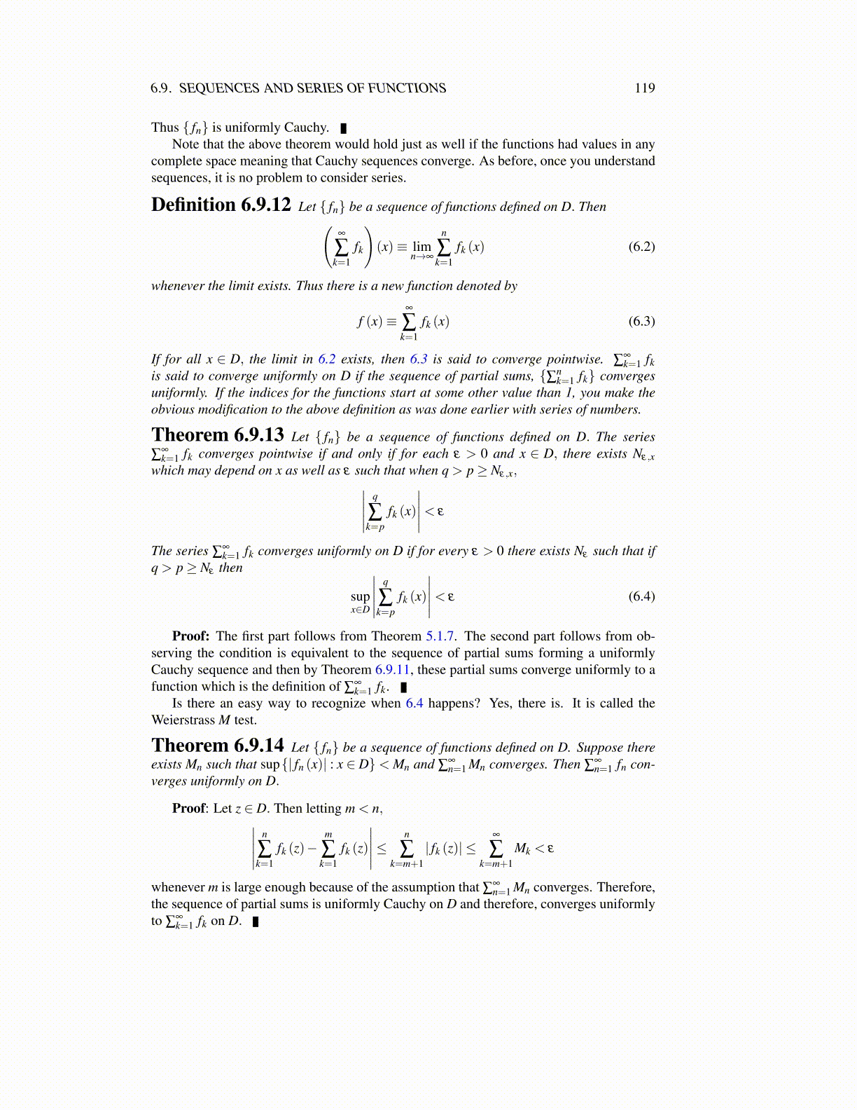 where δ is a positive number chosen in an auspicious manner about to be described. Sincef is continuous on [0,1] , it follows from Theorems 4.8.2 and 6.7.2 that f is uniformlycontinuous. Therefore, letting ε > 0, there exists δ > 0 such that if |x− y| < δ , then| f (x)− f (y)| < ε/2. This is the auspicious choice for δ . Also, by Lemma 6.3.2 | f (x)|for x ∈ [0,1] is bounded by some number M. Thus 6.6 implies that for x ∈ [0,1] ,