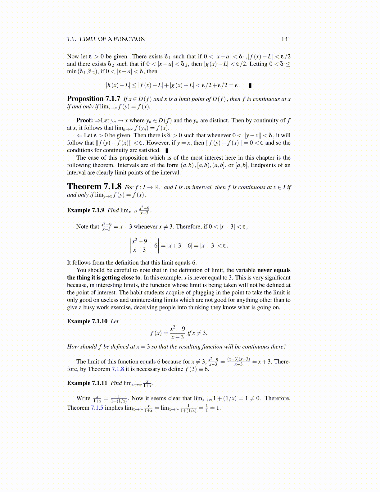 20. The whole presentation of limits above is too specialized. Let D be the domain of afunction f . A point x not necessarily in D, is said to be a limit point of D if B(x,r)contains a point of D not equal to x for every r > 0. Now define the concept of limitin the same way as above and show that the limit is well defined if it exists. That is,if x is a limit point of D and limy→x f (x) = L1 and limy→x f (x) = L2, then L1 = L2. Isit possible to take a limit of a function at a point not a limit point of D? What wouldhappen to the above property of the limit being well defined? Is it reasonable todefine continuity at isolated points, those points which are not limit points, in termsof a limit as is often done in calculus books?