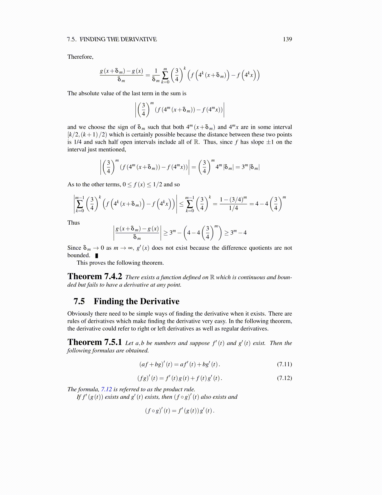 Corollary 7.5.2 Let f ′ (t) ,g′ (t) both exist and g(t) ̸= 0, then the quotient rule holds.(fg