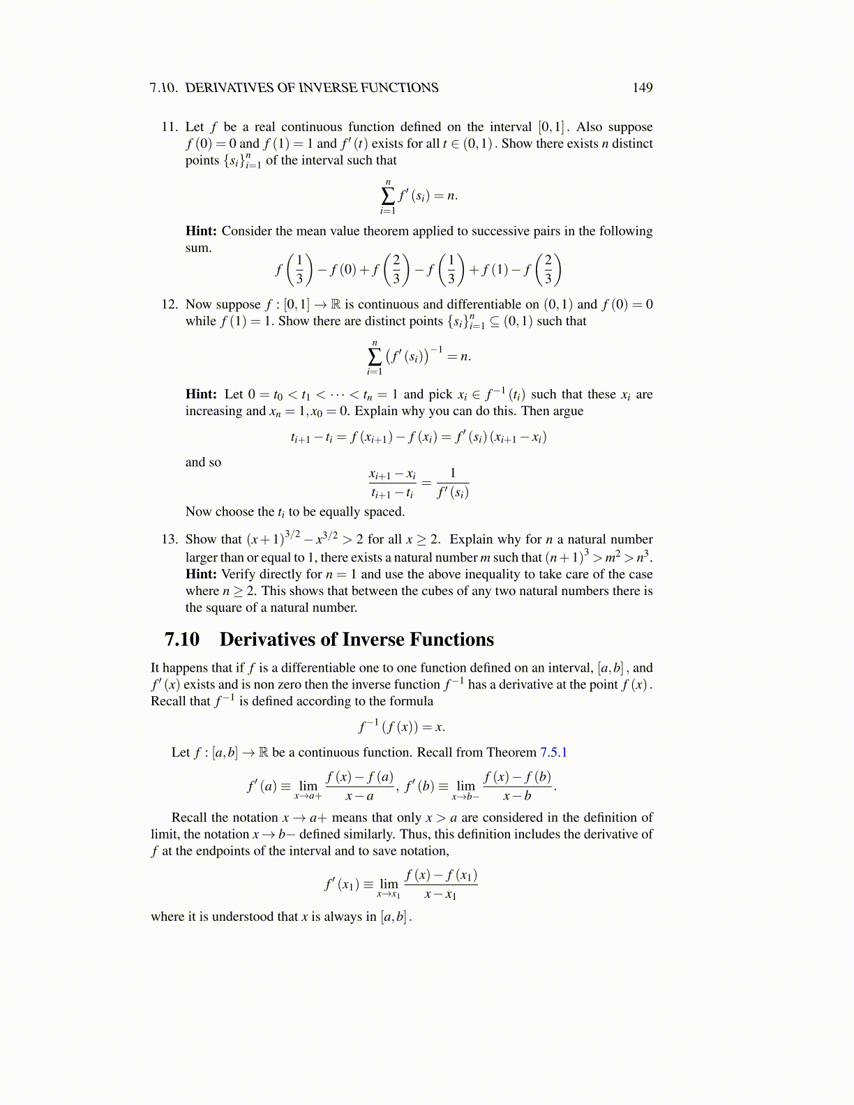 By Corollary 7.8.6 on Page 145, this function is strictly increasing on R and so it has aninverse function although I have no idea how to find an explicit formula for this inversefunction. However, I can see that f (0) = 8 and so by the formula for the derivative of aninverse function, (