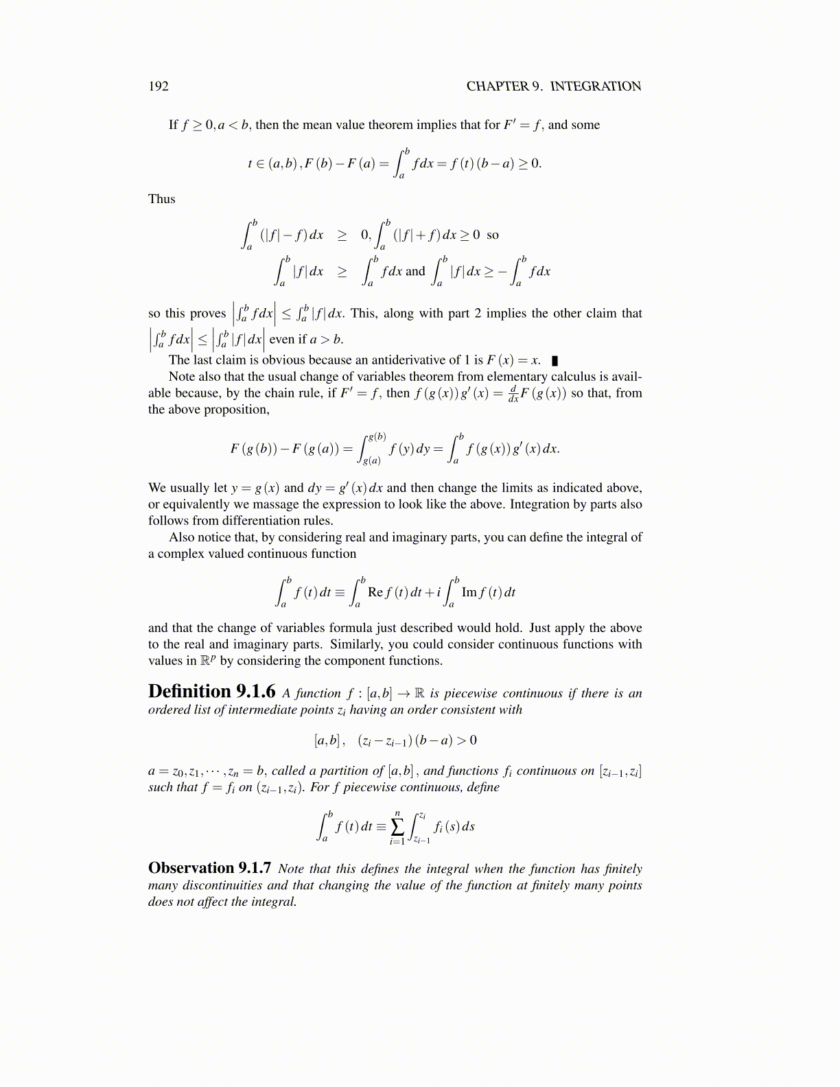 9.2 The Riemann Stieltjes IntegralIn this section are the principal theorems about Stieltjes integrals, including the classicalRiemann integral, as a special case. A good source for more of these things is the book byApostol [2] and Hobson [18]. The difference here is that instead of dx you use dg where gis a function, usually of bounded variation. This is more general than the previous section.You simply take g(x) = x in what follows and obtain the earlier material. I wanted to givea review of familiar material first before launching in to Stieltjes integrals.