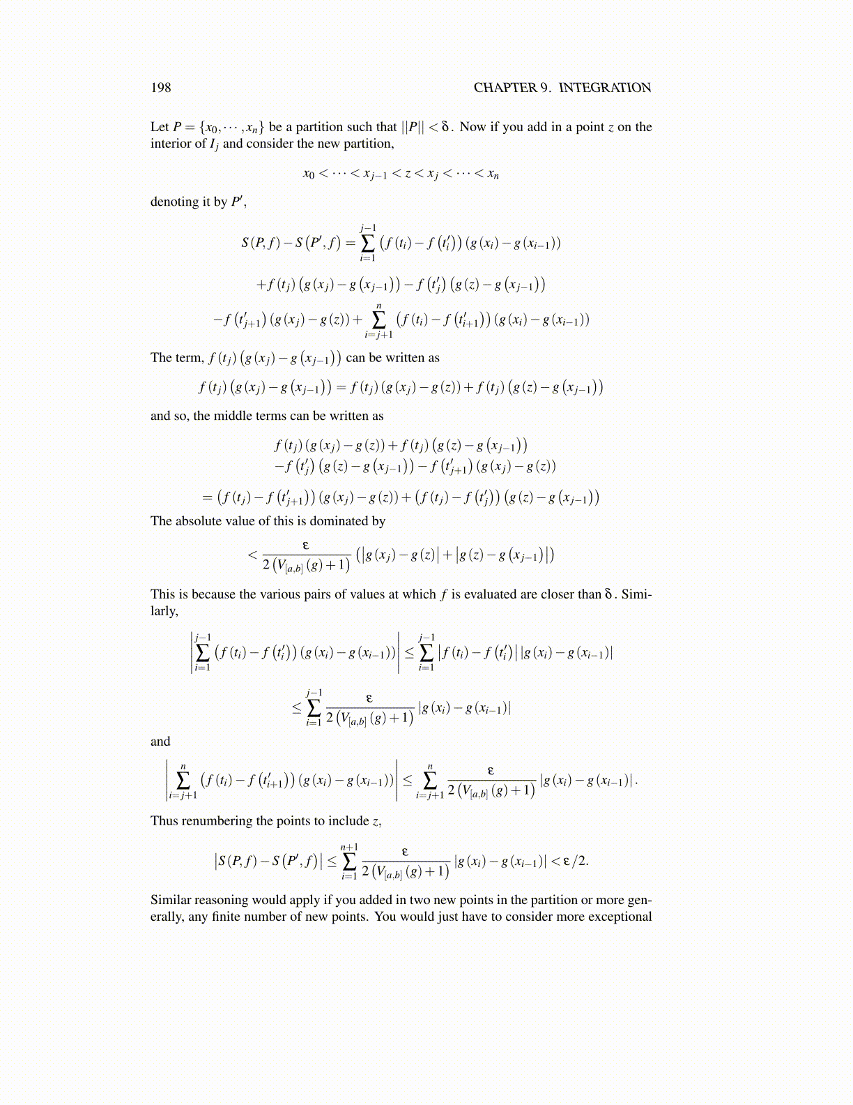 Now consider the first sum. Since | f (x)| ≤M,(Mi−mi)(g(xi)−g(xi−1)) ≤ 2M∥Pg∥ andso, since each of these intervals [xi−1,xi] for i ∈ I contains at least one point of Q, there canbe no more than n of these. Hence the first sum is dominated by 2Mn