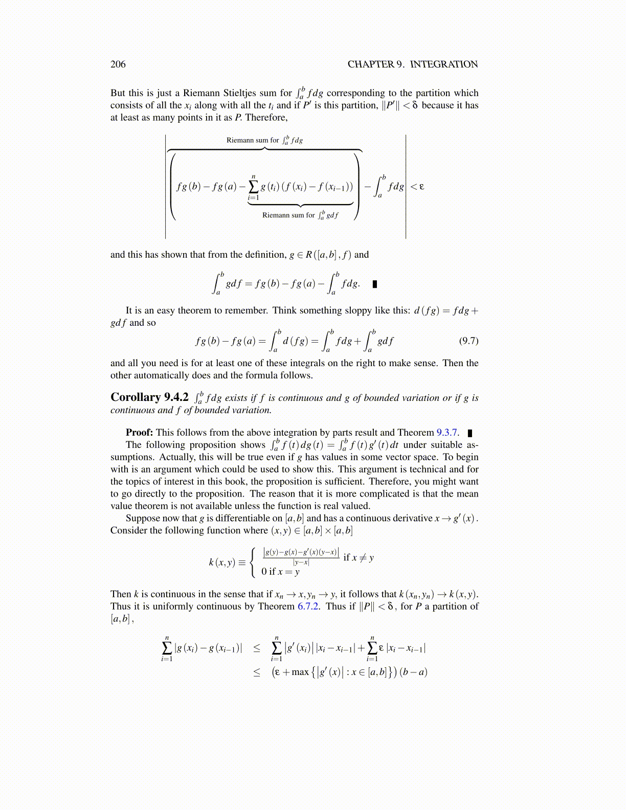 Proposition 9.4.4 Let f ,g both be continuous on [a,b] with continuous bounded deriv-atives on (a,b) . Then the usual calculus integration by parts formula 9.8 is valid.