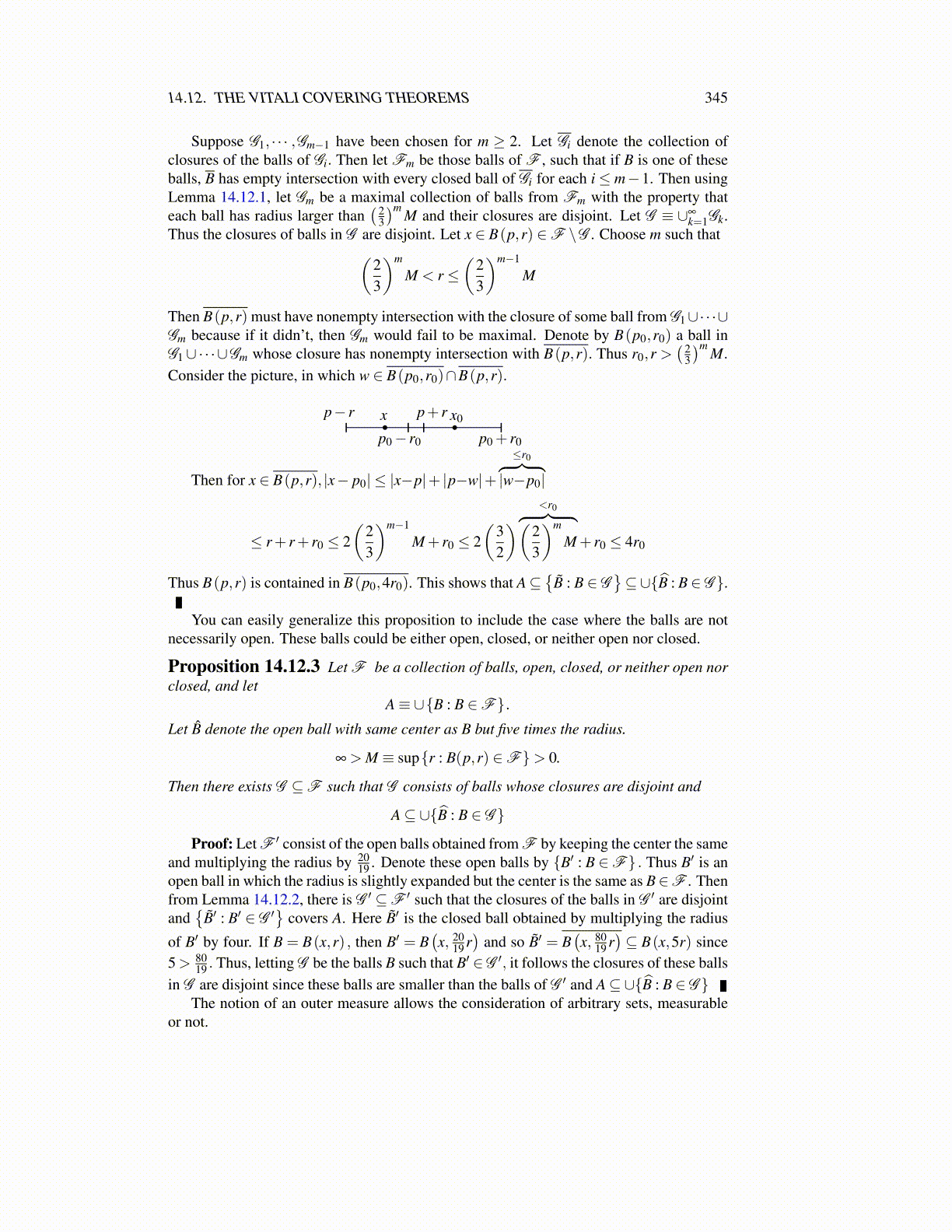 9 m̄(F) .This is possible because of regularity of m shown earlier. Since this is a Vitali covering, foreach x ∈ F, there is one of these balls B containing x such that B̂ ⊆U . Recall this meansyou keep the same center but make the radius 5 times as large. Let Ĉ denote those ballsof C such that B̂⊆U also. Thus, this is also a cover of F . By the Vitali covering theoremabove, Proposition 14.12.3, there are disjoint balls from C {Bi} such that