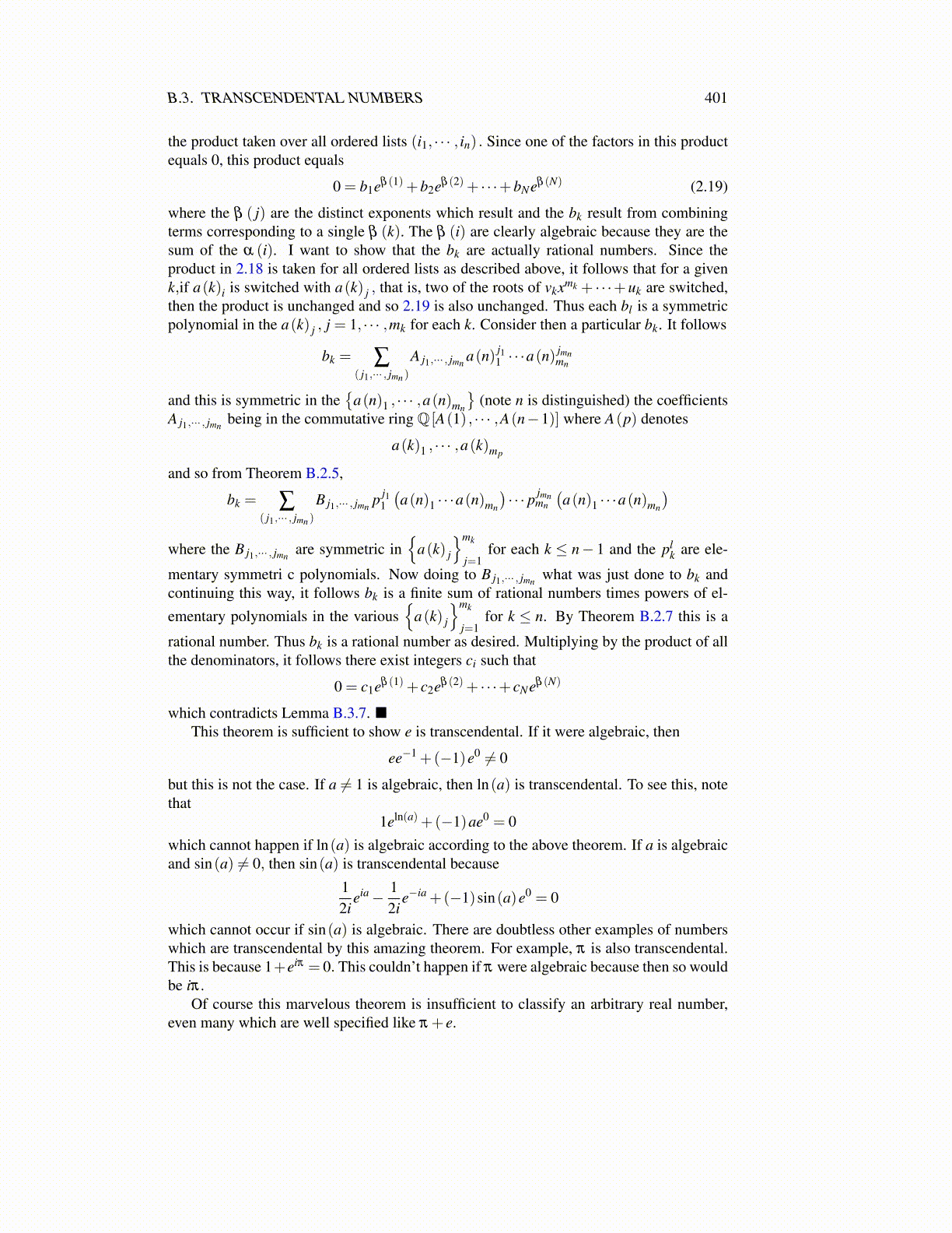 Note that this shows π is irrational. If π = k/m where k,m are integers, then both iπand −iπ are roots of the polynomial with integer coefficients, m2x2 + k2 which wouldrequire, from what was just shown that