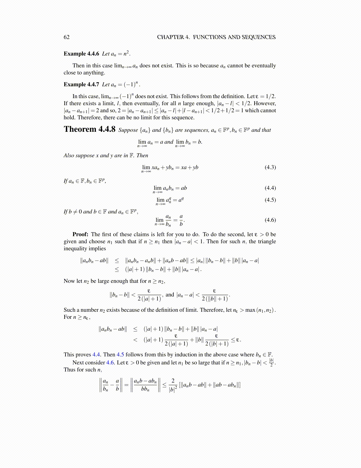 62 CHAPTER 4. FUNCTIONS AND SEQUENCESProof: I will show the second claim because it includes the first as a special case.Letting € > 0 be given, for all n large enough, |y—y,| < € so y > y, — €. Similarly, for nlarge enough, x < x, + €. Therefore,y—xX>Yn—E— (Xp +E) = (Yn —Xn) — 2E > —2ESince € is arbitrary, it follows thaty—x>0. JAnother important observation is that if a sequence converges, then it must be bounded.Proposition 4.4.14 Suppose x, — x. Then ||x;|| is bounded by some M < ~.Proof: There exists N such that if n > N, then ||x —x,|| < 1. It follows from the triangleinequality, see Proposition 4.4.2, that for n > N,||x,|| < 1+ |lx||. There are only finitelymany x; for k < N and so for all k,||xq|| < max {1+ |x|], |lax|| kK <N}SM<o. OE4.5 Cauchy SequencesA Cauchy sequence is one which “bunches up”. This concept was developed by Bolzanoand Cauchy. It is a fundamental idea in analysis.Definition 4.5.1 {a,} is a Cauchy sequence if for all € > 0, there exists ng such thatwhenever n,m > Neg, |dn — Am| < €.A sequence is Cauchy means the terms are “bunching up to each other” as m,n getlarge.Theorem 4.5.2 The set of terms (values) of a Cauchy sequence in F? is bounded.Proof: Let € = | in the definition of a Cauchy sequence and let n > n,. Then from thedefinition, ||ay — dn, || < 1. It follows from the triangle inequality that for all n > 11, ||an|| <1+ ||an, || Therefore, for all n, |[an|] < 1+ |lan, || + Leb, |laell-Theorem 4.5.3 If a sequence {a,} in F? converges, then the sequence is a Cauchysequence.Proof: Let € > 0 be given and suppose a, — a. Then from the definition of con-vergence, there exists ng such that if n > ne, it follows that ||a, —al|| < 5. Therefore, ifm,n > ne +1, it follows that ||an —am|| < ||@n — || + ||a—am|| < § + § = € showing that,since € > 0 is arbitrary, {a,} is a Cauchy sequence.The following theorem is very useful and is likely the most important property ofCauchy sequences. You know that if a sequence converges, then every subsequence con-verges to the same thing. However, you can have a sequence which does not converge,Gy = (—1)" for example which has a convergent subsequence, nz = 2k in this example.This won’t happen with a Cauchy sequence.Theorem 4.5.4 Suppose {an} is a Cauchy sequence in F? and there exists a subse-quence, {an, } which converges to a. Then {a,} also converges to a.Proof: Let € > 0 be given. There exists N such that if m,n > N, then ||am_—ay|| < €/2.Also there exists K such that if k > K, then \|]a — an, | < €/2. Then let k > max(K,N).Then for such k,|}ax — al < |[ax — an, || + ||an, — al] < €/2+e/2=€. OfThis theorem holds in all instances where it makes sense to speak of Cauchy sequences.