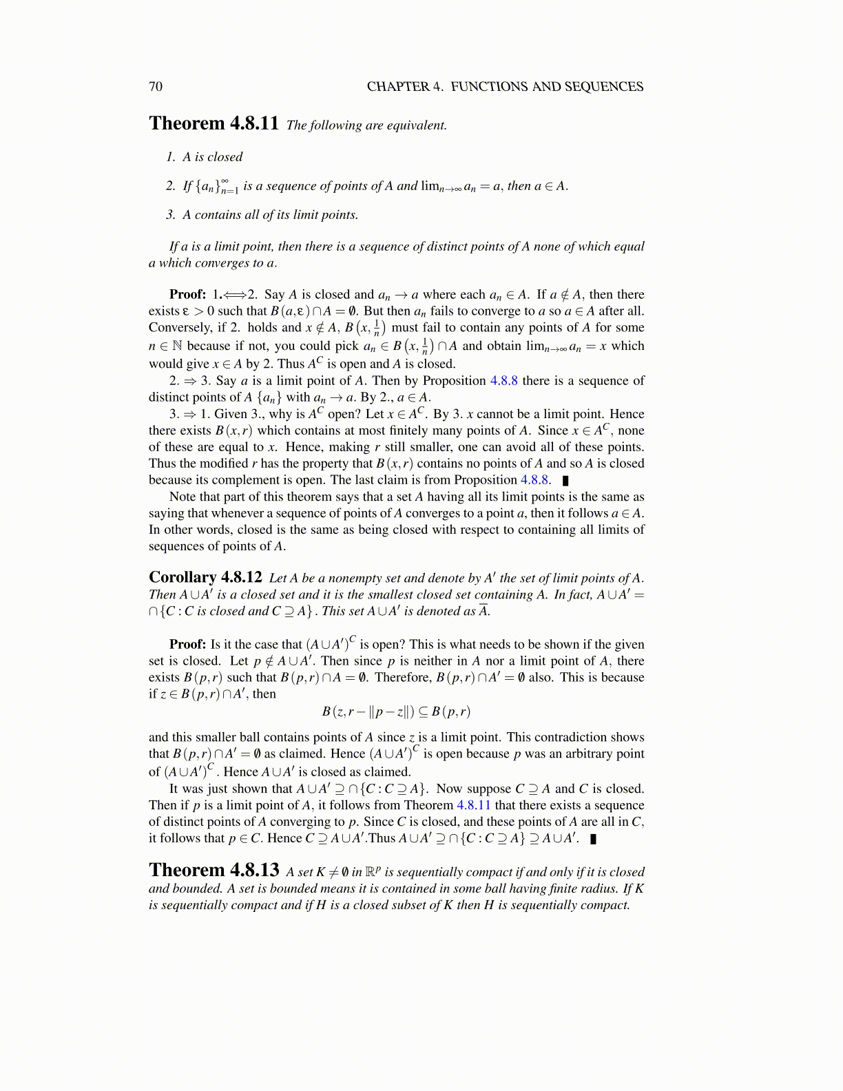 Proof: It was shown above in Theorem 4.8.14 that 2. ⇐⇒ 3. Consider 3.⇒ 1. If Cis an open cover of K, then I claim there exists δ > 0 such that if k ∈ K, then B(k,δ )⊆Ufor some U ∈ C . This δ is called a Lebesgue number. If not, then there exists kn ∈ K suchthat B