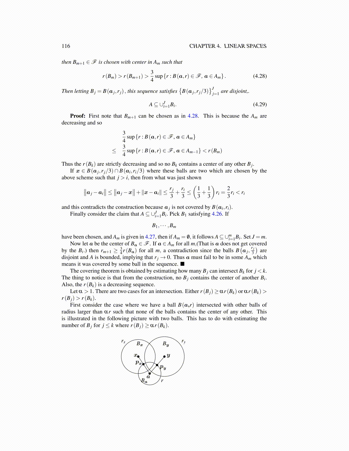 The covering theorem is obtained by estimating how many B j can intersect Bk for j < k.The thing to notice is that from the construction, no B j contains the center of another Bi.Also, the r (Bk) is a decreasing sequence.