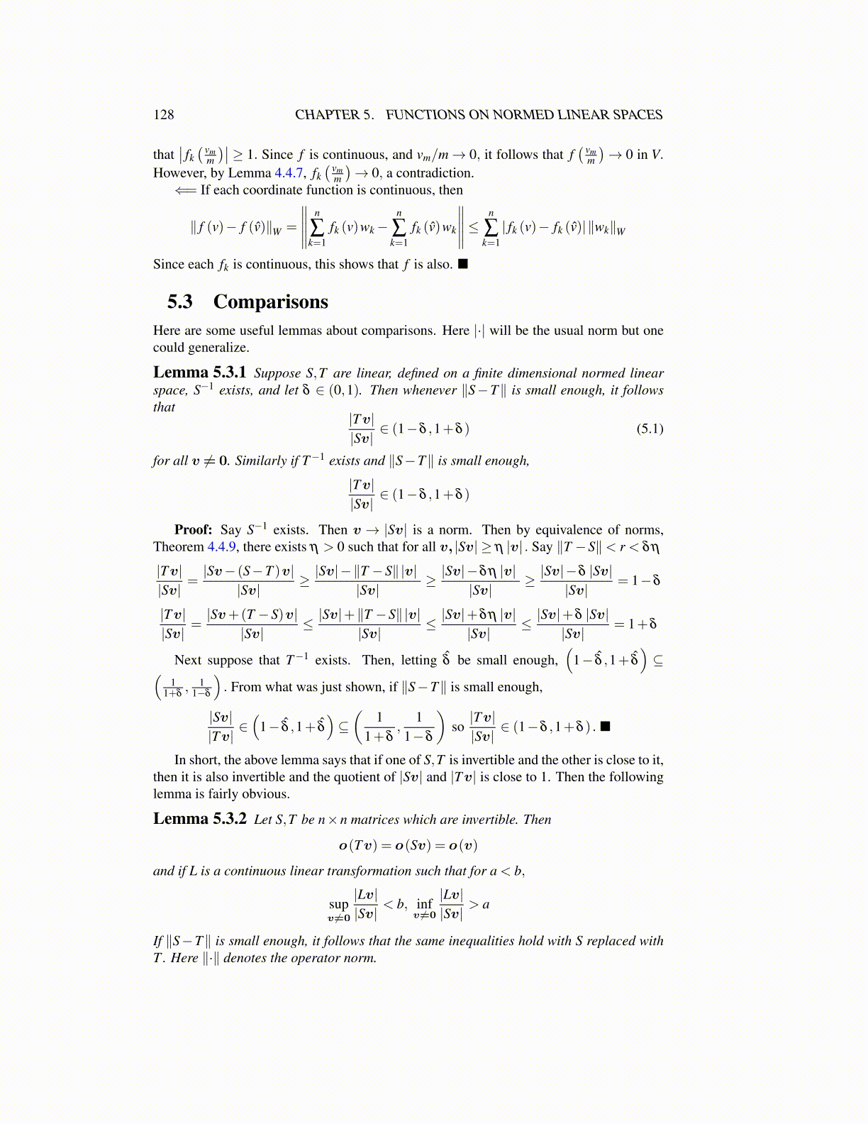 Lemma 5.3.1 Suppose S,T are linear, defined on a finite dimensional normed linearspace, S−1 exists, and let δ ∈ (0,1). Then whenever ∥S−T∥ is small enough, it followsthat