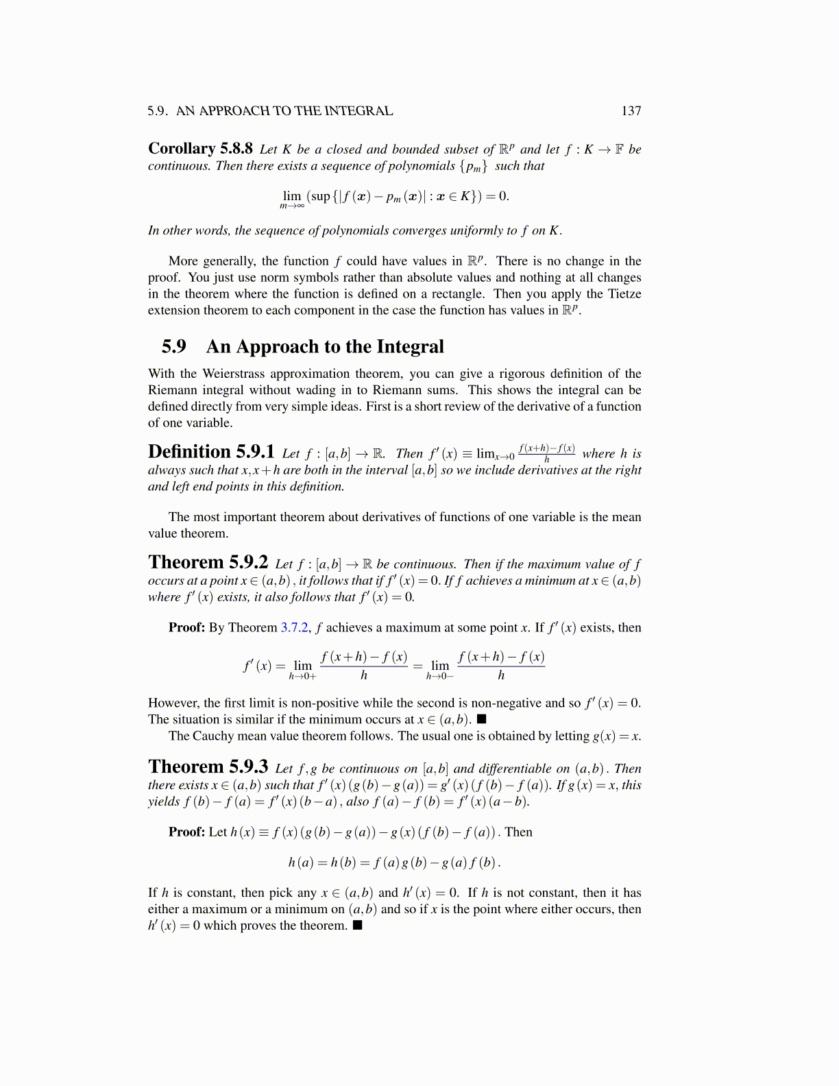 5.9 An Approach to the IntegralWith the Weierstrass approximation theorem, you can give a rigorous definition of theRiemann integral without wading in to Riemann sums. This shows the integral can bedefined directly from very simple ideas. First is a short review of the derivative of a functionof one variable.