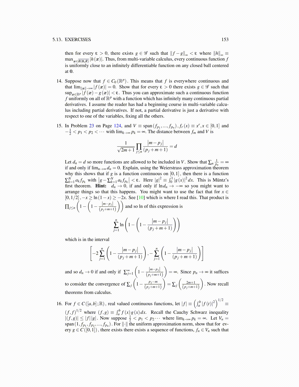 14. Suppose now that f ∈ C0 (Rp) . This means that f is everywhere continuous andthat lim∥x∥→∞ | f (x)| = 0. Show that for every ε > 0 there exists g ∈ G such thatsupx∈Rp | f (x)−g(x)| < ε . Thus you can approximate such a continuous functionf uniformly on all ofRp with a function which has infinitely many continuous partialderivatives. I assume the reader has had a beginning course in multi-variable calcu-lus including partial derivatives. If not, a partial derivative is just a derivative withrespect to one of the variables, fixing all the others.
