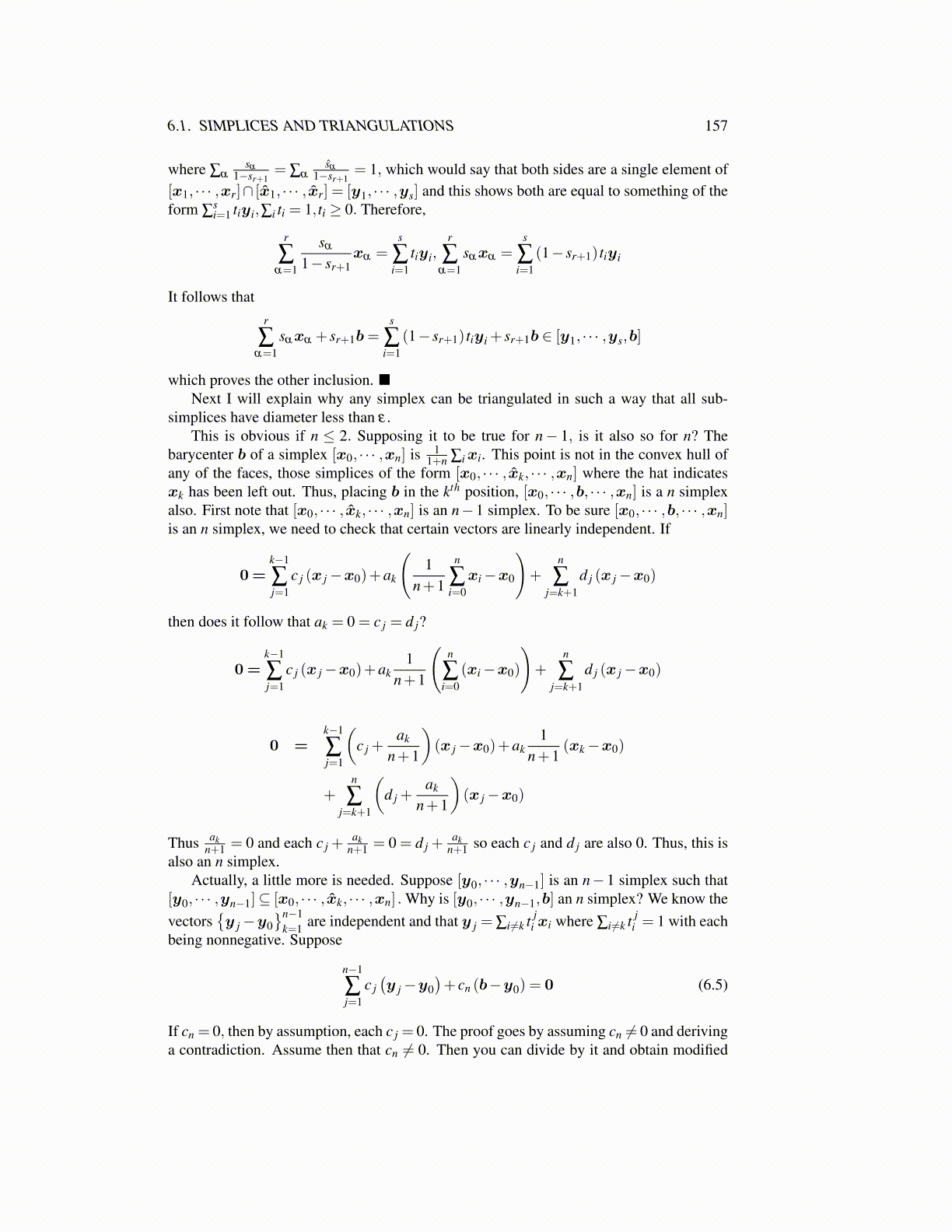 any of the faces, those simplices of the form [x0, · · · , x̂k, · · · ,xn] where the hat indicatesxk has been left out. Thus, placing b in the kth position, [x0, · · · ,b, · · · ,xn] is a n simplexalso. First note that [x0, · · · , x̂k, · · · ,xn] is an n−1 simplex. To be sure [x0, · · · ,b, · · · ,xn]is an n simplex, we need to check that certain vectors are linearly independent. If