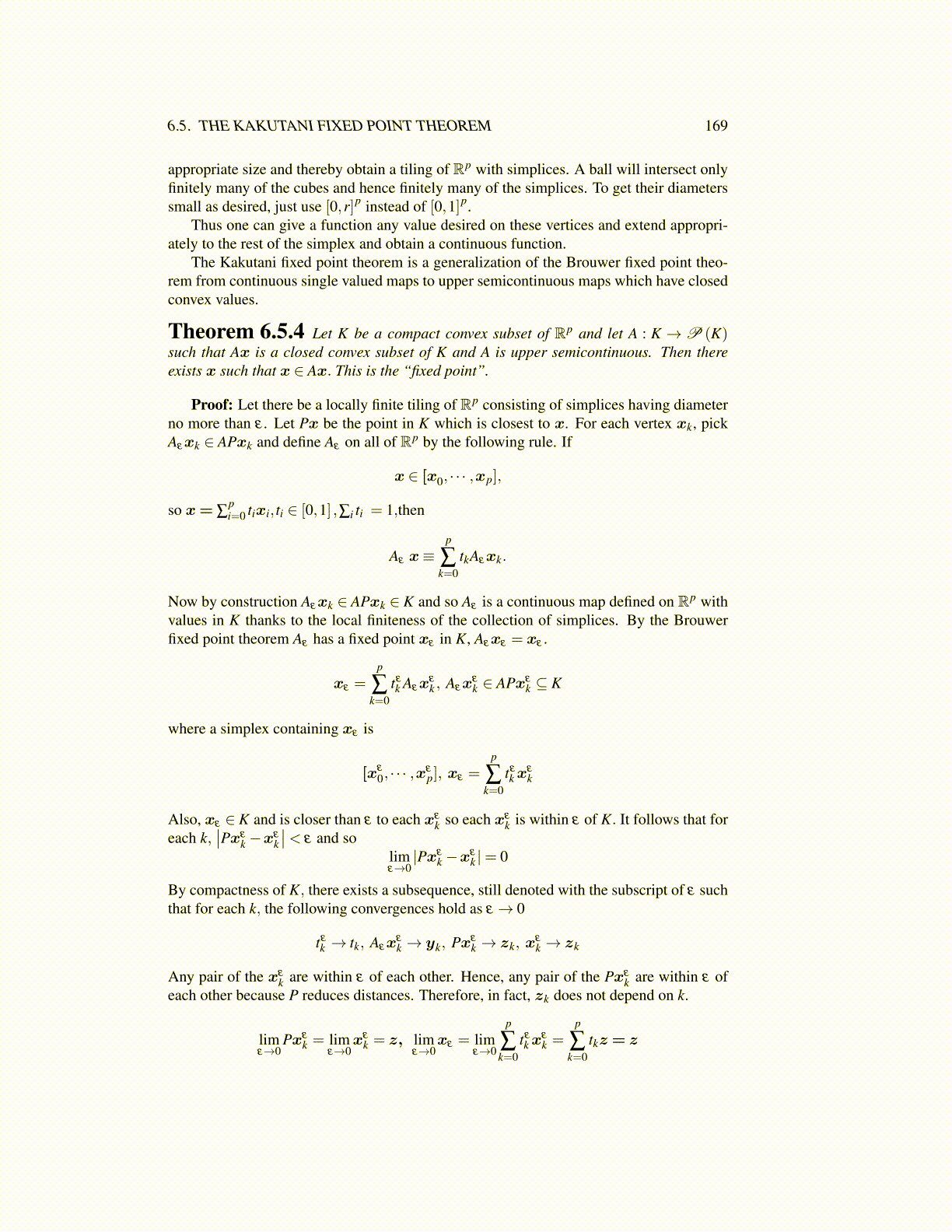 Theorem 6.5.4 Let K be a compact convex subset of Rp and let A : K →P (K)such that Ax is a closed convex subset of K and A is upper semicontinuous. Then thereexists x such that x ∈ Ax. This is the “fixed point”.