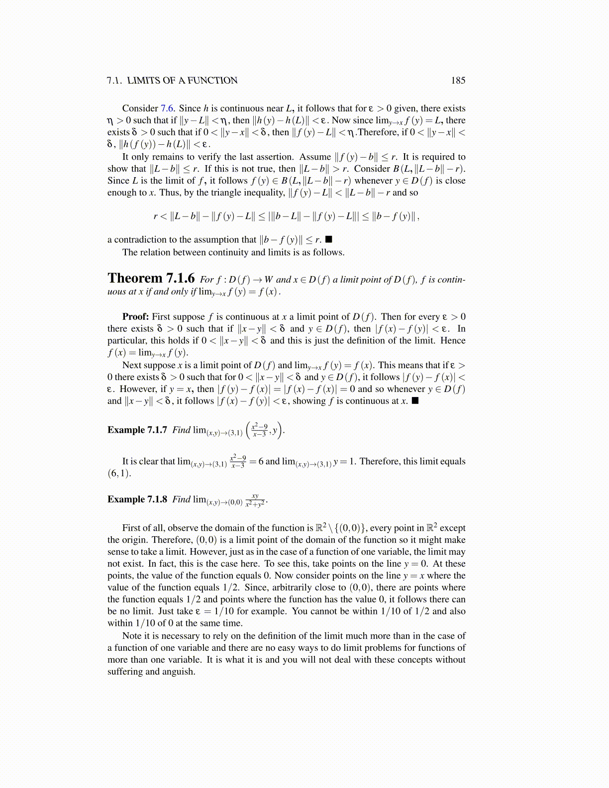 Consider 7.6. Since h is continuous near L, it follows that for ε > 0 given, there existsη > 0 such that if ∥y−L∥< η , then ∥h(y)−h(L)∥< ε. Now since limy→x f (y) = L, thereexists δ > 0 such that if 0 < ∥y− x∥< δ , then ∥ f (y)−L∥< η .Therefore, if 0 < ∥y− x∥<δ , ∥h( f (y))−h(L)∥< ε.