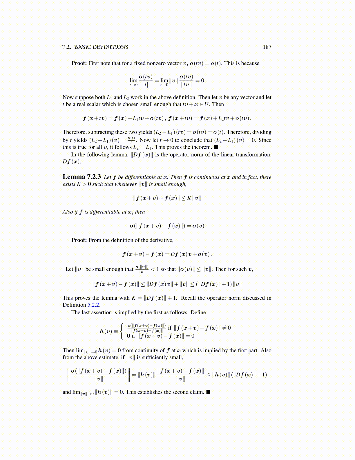 Lemma 7.2.3 Let f be differentiable at x. Then f is continuous at x and in fact, thereexists K > 0 such that whenever ∥v∥ is small enough,