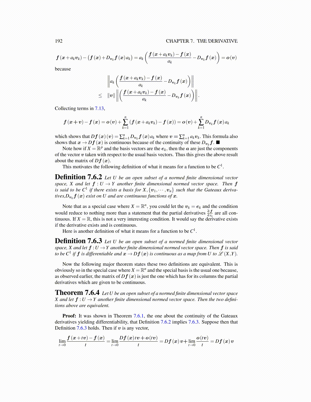 Definition 7.6.2 Let U be an open subset of a normed finite dimensional vectorspace, X and let f : U → Y another finite dimensional normed vector space. Then fis said to be C1 if there exists a basis for X ,{v1, · · · ,vn} such that the Gateaux deriva-tives,Dvkf (x) exist on U and are continuous functions of x.