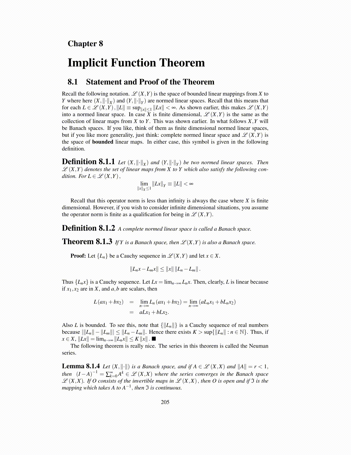 Lemma 8.1.4 Let (X ,∥·∥) is a Banach space, and if A ∈ L (X ,X) and ∥A∥ = r < 1,then (I−A)−1 = ∑