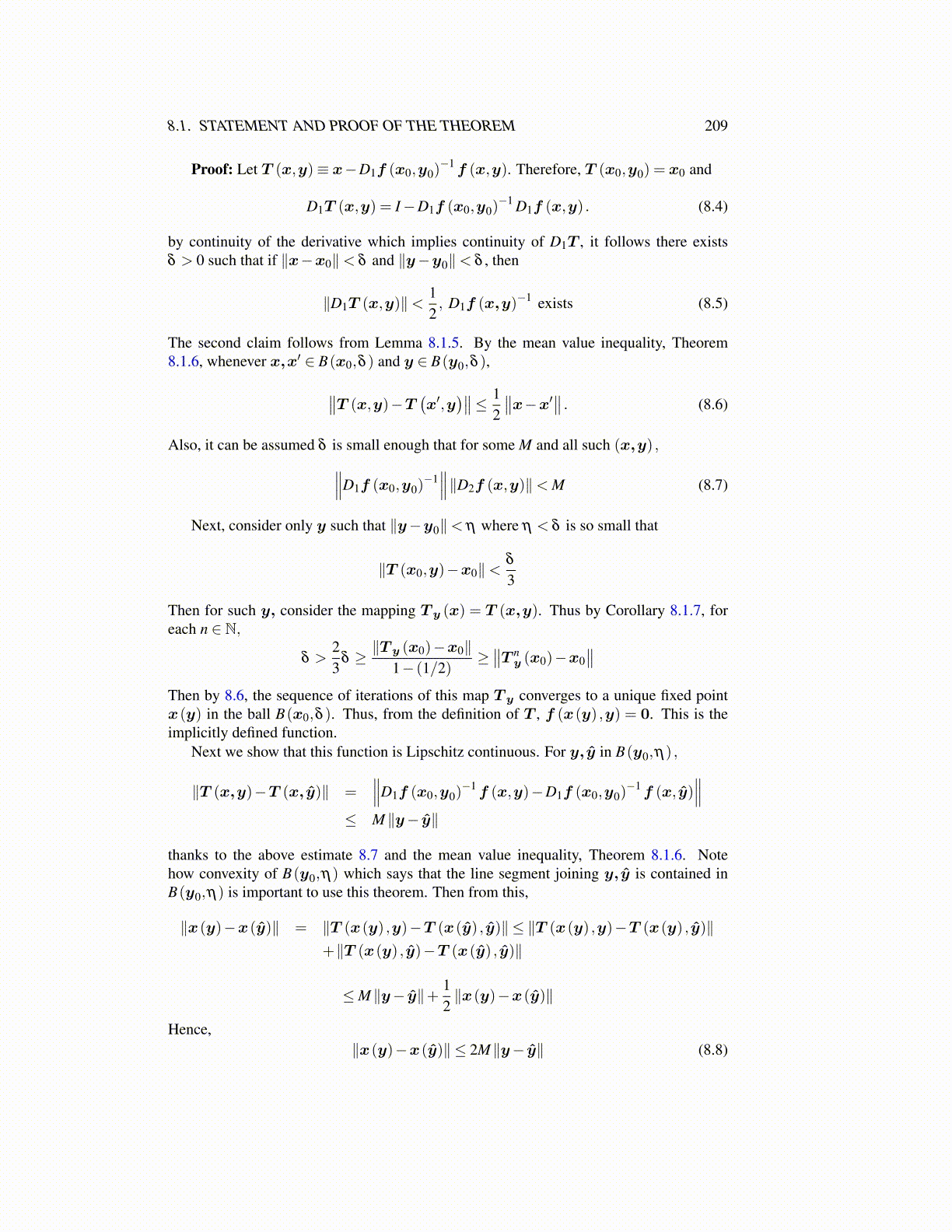 Then by 8.6, the sequence of iterations of this map T y converges to a unique fixed pointx(y) in the ball B(x0,δ ). Thus, from the definition of T , f (x(y) ,y) = 0. This is theimplicitly defined function.