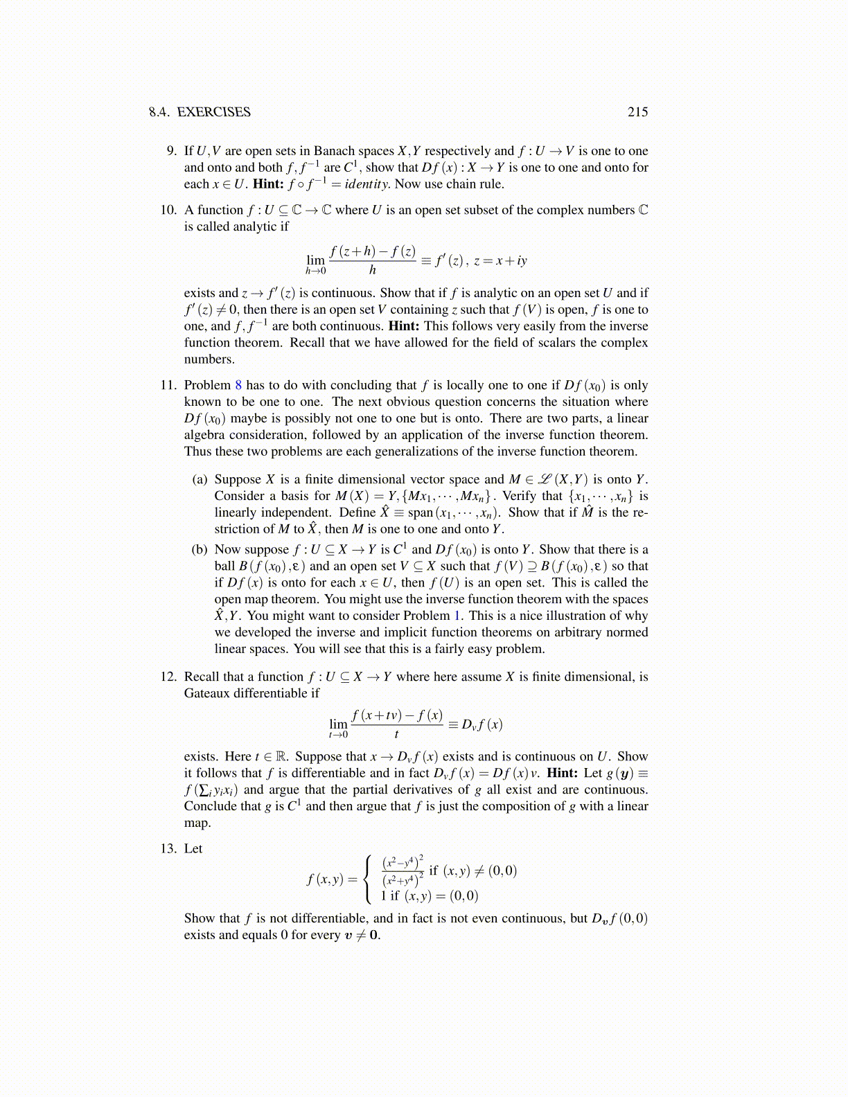 exists. Here t ∈ R. Suppose that x→ Dv f (x) exists and is continuous on U . Showit follows that f is differentiable and in fact Dv f (x) = D f (x)v. Hint: Let g(y) ≡f (∑i yixi) and argue that the partial derivatives of g all exist and are continuous.Conclude that g is C1 and then argue that f is just the composition of g with a linearmap.