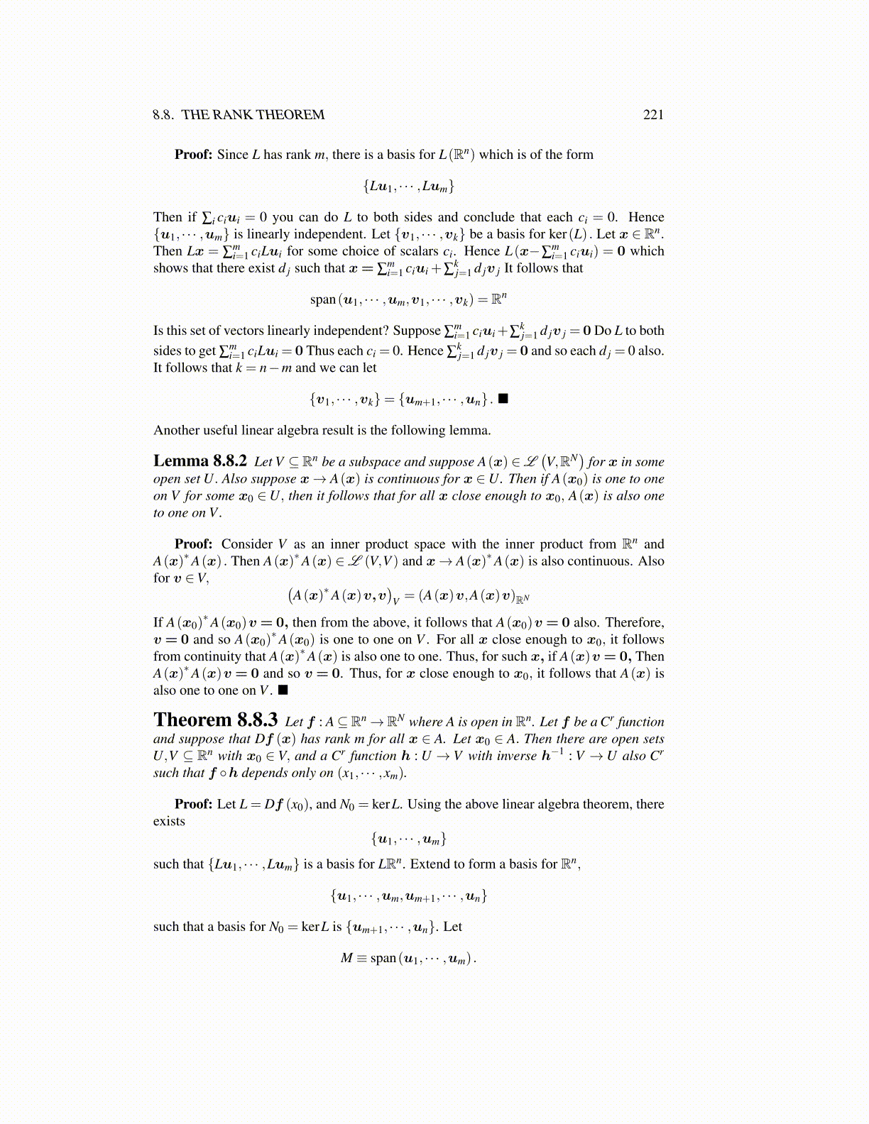 Theorem 8.8.3 Let f : A⊆Rn→RN where A is open in Rn. Let f be a Cr functionand suppose that Df (x) has rank m for all x ∈ A. Let x0 ∈ A. Then there are open setsU,V ⊆ Rn with x0 ∈ V, and a Cr function h : U → V with inverse h−1 : V →U also Cr