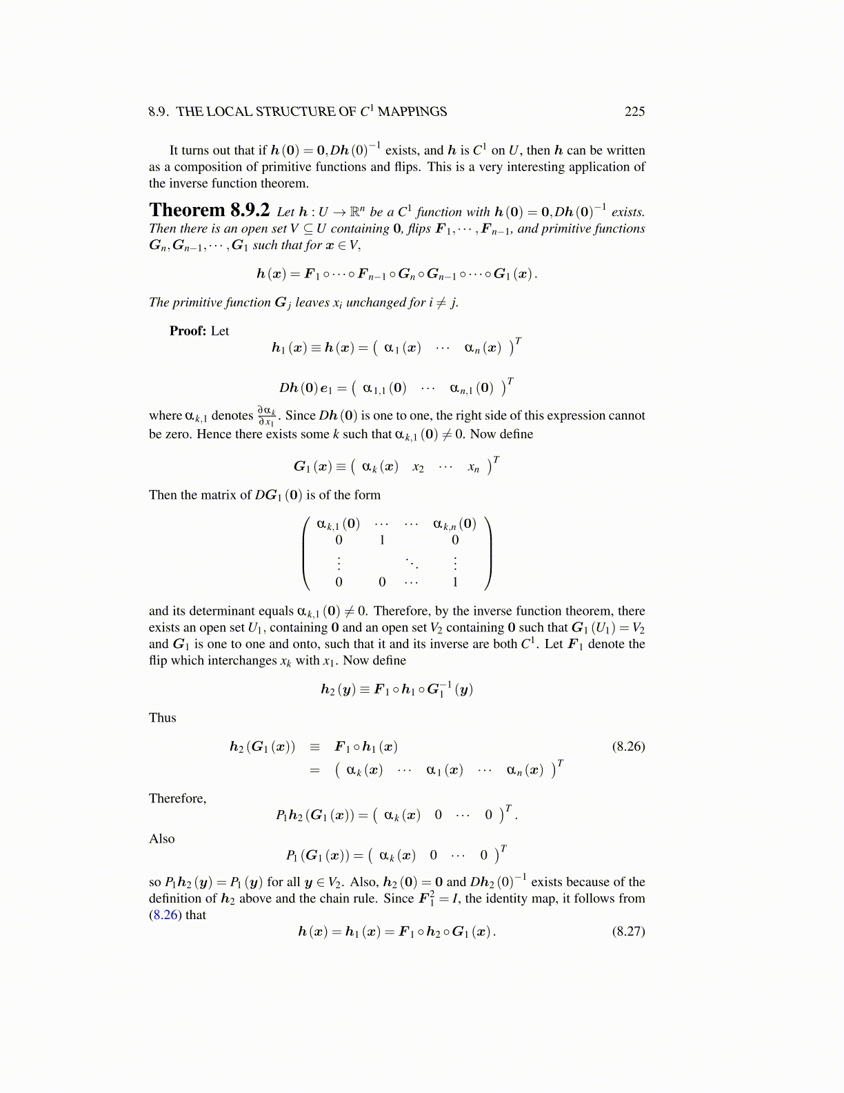 Theorem 8.9.2 Let h : U → Rn be a C1 function with h(0) = 0,Dh(0)−1 exists.Then there is an open set V ⊆U containing 0, flips F 1, · · · ,F n−1, and primitive functionsGn,Gn−1, · · · ,G1 such that for x ∈V,