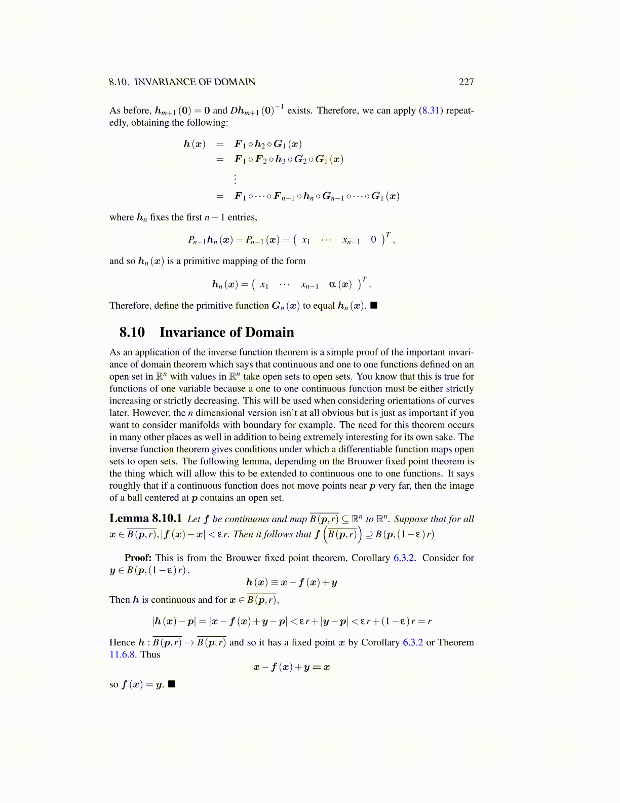 8.10 Invariance of DomainAs an application of the inverse function theorem is a simple proof of the important invari-ance of domain theorem which says that continuous and one to one functions defined on anopen set in Rn with values in Rn take open sets to open sets. You know that this is true forfunctions of one variable because a one to one continuous function must be either strictlyincreasing or strictly decreasing. This will be used when considering orientations of curveslater. However, the n dimensional version isn’t at all obvious but is just as important if youwant to consider manifolds with boundary for example. The need for this theorem occursin many other places as well in addition to being extremely interesting for its own sake. Theinverse function theorem gives conditions under which a differentiable function maps opensets to open sets. The following lemma, depending on the Brouwer fixed point theorem isthe thing which will allow this to be extended to continuous one to one functions. It saysroughly that if a continuous function does not move points near p very far, then the imageof a ball centered at p contains an open set.