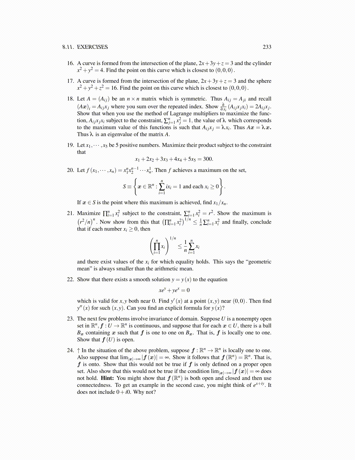24. ↑ In the situation of the above problem, suppose f : Rn→ Rn is locally one to one.Also suppose that lim|x|→∞ |f (x)| = ∞. Show it follows that f (Rn) = Rn. That is,f is onto. Show that this would not be true if f is only defined on a proper openset. Also show that this would not be true if the condition lim|x|→∞ |f (x)|= ∞ doesnot hold. Hint: You might show that f (Rn) is both open and closed and then useconnectedness. To get an example in the second case, you might think of ex+iy. Itdoes not include 0+ i0. Why not?