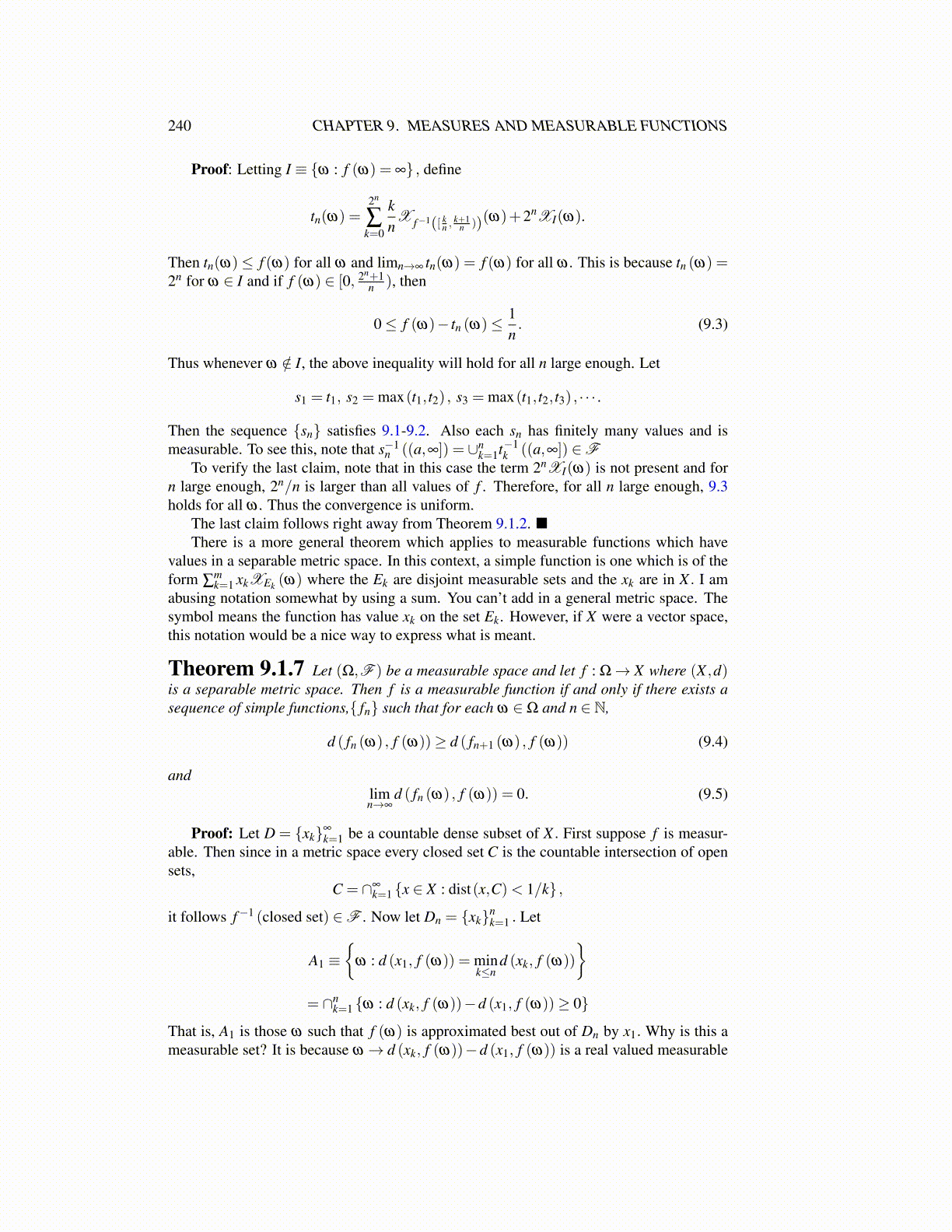 Theorem 9.1.7 Let (Ω,F ) be a measurable space and let f : Ω→ X where (X ,d)is a separable metric space. Then f is a measurable function if and only if there exists asequence of simple functions,{ fn} such that for each ω ∈Ω and n ∈ N,